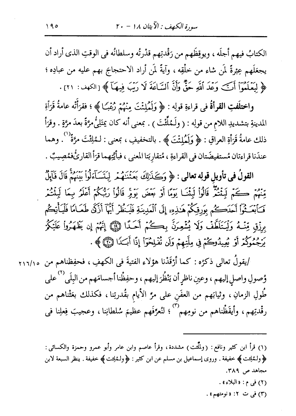 الْكِتَابُ فِيهِمْ أَجَلُهُ، وَتُوقِظُهُمْ مِنْ رَقْدَتِهِمْ قَدَّرْتُهُ وَسُلْطَانِهِ فِي الْوَقْتِ الَّذِي أَرَادَ أَنْ يَجْعَلَهُمْ عِبْرَةً لِمَنْ شَاءَ مِنْ خَلْقِهِ، وَآيَةً لِمَنْ أَرَادَ الِاحْتِجَاجَ بِهِمْ عَلَيْهِ مِنْ عِبَادِهِ، لِيَعْلَمُوا أَنَّ وَعْدَ اللَّهِ حَقٌّ، وَأَنَّ السَّاعَةَ آتِيَةٌ لَا رَيْبَ فِيهَا. وَاخْتَلَفَتِ الْقُرَّاءُ فِي قِرَاءَةِ قَوْلِهِ: {وَلَمُلِئْتَ مِنْهُمْ رُعْبًا} [الكهف: 18] فَقَرَأَتْهُ عَامَّةُ قُرَّاءِ الْمَدِينَةِ بِتَشْدِيدِ اللَّامِ مِنْ قَوْلِهِ: (وَلَمُلِّئْتَ) بِمَعْنَى أَنَّهُ كَانَ يَمْتَلِئُ مَرَّةً بَعْدَ مَرَّةٍ. وَقَرَأَ ذَلِكَ عَامَّةُ قُرَّاءِ الْعِرَاقِ: {وَلَمُلِئْتَ} [الكهف: 18] بِالتَّخْفِيفِ، بِمَعْنَى: لَمُلِئْتَ مَرَّةً، وَهُمَا عِنْدَنَا قِرَاءَتَانِ مُسْتَفِيضَتَانِ فِي الْقِرَاءَةِ، مُتَقَارِبَتَا الْمَعْنَى، فَبِأَيَّتِهِمَا قَرَأَ الْقَارِئُ فَمُصِيبٌ