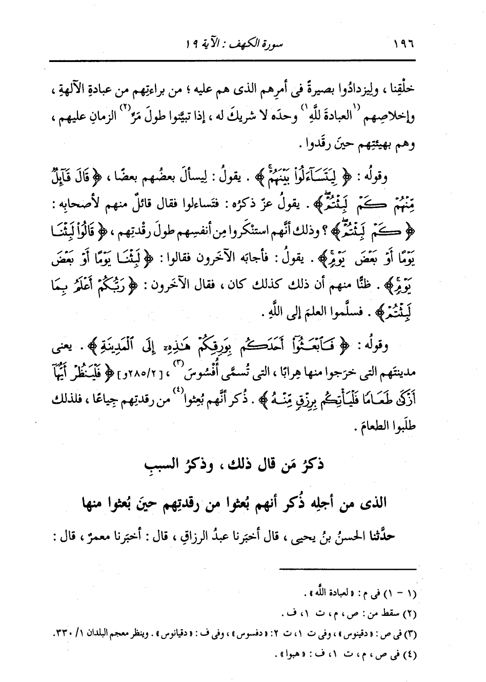 ذِكْرُ مَنْ قَالَ ذَلِكَ، وَذِكْرُ السَّبَبِ الَّذِي مِنْ أَجْلِهِ ذُكِرَ أَنَّهُمْ بُعِثُوا مِنْ رَقْدَتِهِمْ حِينَ بُعِثُوا مِنْهَا: حَدَّثَنَا الْحَسَنُ بْنُ يَحْيَى، قَالَ: أَخْبَرَنَا عَبْدُ الرَّزَّاقِ، قَالَ: أَخْبَرَنَا مَعْمَرٌ، قَالَ: -[197]- أَخْبَرَنِي إِسْمَاعِيلُ بْنُ شَرْوَسٍ، أَنَّهُ سَمِعَ وَهْبَ بْنَ مُنَبِّهٍ، يَقُولُ: §إِنَّهُمْ غَبَرُوا، يَعْنِي الْفِتْيَةَ مِنْ أَصْحَابِ الْكَهْفِ بَعْدَ مَا بُنِيَ عَلَيْهِمْ بَابُ الْكَهْفِ زَمَانًا بَعْدَ زَمَانٍ، ثُمَّ إِنَّ رَاعِيًا أَدْرَكَهُ الْمَطَرُ عِنْدَ الْكَهْفِ، فَقَالَ: لَوْ فَتَحْتُ هَذَا الْكَهْفَ وَأَدْخَلْتُ غَنَمِي مِنَ الْمَطَرِ، فَلَمْ يَزَلْ يُعَالِجُهُ حَتَّى فَتَحَ مَا أَدْخَلَهُ فِيهِ، وَرَدَّ إِلَيْهِمْ أَرْوَاحَهُمْ فِي أَجْسَامِهِمْ مِنَ الْغَدِ حِينَ أَصْبَحُوا، فَبَعَثُوا أَحَدَهُمْ بِوَرِقٍ يَشْتَرِي طَعَامًا، فَلَمَّا أَتَى بَابَ مَدِينَتِهِمْ، رَأَى شَيْئًا يُنْكِرُهُ، حَتَّى دَخَلَ عَلَى رَجُلٍ، فَقَالَ: بِعْنِي بِهَذِهِ الدَّرَاهِمِ طَعَامًا، فَقَالَ: وَمِنْ أَيْنَ لَكَ هَذِهِ الدَّرَاهِمُ؟ قَالَ: خَرَجْتُ أَنَا وَأَصْحَابٌ لِي أَمْسِ، فَآوَانَا اللَّيْلُ، ثُمَّ أَصْبَحُوا، فَأَرْسَلُونِي، فَقَالَ: هَذِهِ الدَّرَاهِمُ كَانَتْ عَلَى عَهْدِ مُلْكِ فُلَانٍ، فَأَنَّى لَكَ بِهَا؟ فَرَفَعَهُ إِلَى الْمَلِكِ، وَكَانَ مَلِكًا صَالِحًا، فَقَالَ: مِنْ أَيْنَ لَكَ هَذِهِ الْوَرِقُ؟ قَالَ: خَرَجْتُ أَنَا وَأَصْحَابٌ لِي أَمْسٍ، حَتَّى أَدْرَكَنَا اللَّيْلُ فِي كَهْفِ كَذَا وَكَذَا، ثُمَّ أَمَرُونِي أَنْ أَشْتَرِيَ لَهُمْ طَعَامًا، قَالَ: وَأَيْنَ أَصْحَابُكَ؟ قَالَ: فِي الْكَهْفِ، قَالَ: فَانْطَلَقُوا مَعَهُ حَتَّى أَتَوْا بَابَ الْكَهْفِ، فَقَالَ: دَعُونِي أَدْخُلُ عَلَى أَصْحَابِي قَبْلَكُمْ، فَلَمَّا رَأَوْهُ، وَدَنَا مِنْهُمْ ضُرِبَ عَلَى أُذُنِهِ وَآذَانِهِمْ، فَجَعَلُوا كُلَّمَا دَخَلَ رَجُلٌ أُرْعِبَ، فَلَمْ يَقْدِرُوا عَلَى أَنْ يَدْخُلُوا عَلَيْهِمْ، فَبَنَوْا عِنْدَهُمْ كَنِيسَةً، -[198]- اتَّخَذُوهَا مَسْجِدًا يُصَلُّونَ فِيهِ