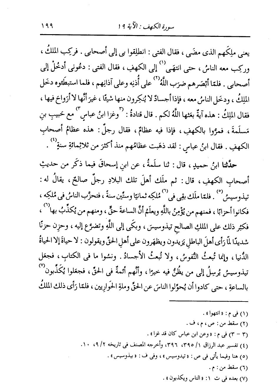 حَدَّثَنَا ابْنُ حُمَيْدٍ، قَالَ: ثنا سَلَمَةُ، عَنِ ابْنِ إِسْحَاقَ، فِيمَا ذُكِرَ مِنْ حَدِيثِ أَصْحَابِ الْكَهْفِ، قَالَ: §ثُمَّ مَلَكَ أَهْلَ تِلْكَ الْبِلَادِ رَجُلٌ صَالِحٌ يُقَالُ لَهُ تيذوسيس، فَلَمَّا مَلَكَ بَقِيَ مُلْكُهُ ثَمَانِيًا وَسِتِّينَ سَنَةً، فَتَحَزَّبَ النَّاسُ فِي مُلْكِهِ، فَكَانُوا أَحْزَابًا، فَمِنْهُمْ مَنْ يُؤْمِنُ بِاللَّهِ، وَيَعْلَمُ أَنَّ السَّاعَةَ حَقٌّ، وَمِنْهُمْ مَنْ يُكَذِّبُ، فَكَبُرَ ذَلِكَ عَلَى الْمَلِكِ الصَّالِحِ تيذوسيس، وَبَكَى إِلَى اللَّهِ وَتَضَرَّعَ إِلَيْهِ، وَحَزِنَ حُزْنًا شَدِيدًا لَمَّا رَأَى أَهْلَ الْبَاطِلِ يَزِيدُونَ وَيَظْهَرُونَ عَلَى أَهْلِ الْحَقِّ وَيَقُولُونَ: لَا حَيَاةَ إِلَّا الْحَيَاةَ الدُّنْيَا، وَإِنَّمَا تُبْعَثُ النُّفُوسُ، وَلَا تُبْعَثُ الْأَجْسَادُ، وَنَسُوا مَا فِي الْكِتَابِ، فَجَعَلَ تيذوسيس يُرْسِلُ إِلَى مَنْ يَظُنُّ فِيهِ خَيْرًا، وَأَنَّهُمْ أَئِمَّةٌ فِي الْحَقِّ، فَجَعَلُوا يُكَذِّبُونَ بِالسَّاعَةِ، حَتَّى كَادُوا أَنْ يُحَوِّلُوا النَّاسَ عَنِ الْحَقِّ وَمِلَّةِ الْحَوَارِيِّينَ، فَلَمَّا رَأَى ذَلِكَ الْمَلِكُ -[200]- الصَّالِحُ تيذوسيس، دَخَلَ بَيْتَهُ فَأَغْلَقَهُ عَلَيْهِ، وَلَبِسَ مَسْحًا وَجَعَلَ تَحْتَهُ رَمَادًا، ثُمَّ جَلَسَ عَلَيْهِ، فَدَأَبَ ذَلِكَ لَيْلَهُ وَنَهَارَهُ زَمَانًا يَتَضَرَّعُ إِلَى اللَّهِ، وَيَبْكِي إِلَيْهِ مِمَّا يَرَى فِيهِ النَّاسُ، ثُمَّ إِنَّ الرَّحْمَنَ الرَّحِيمَ الَّذِي يَكْرَهُ هَلَكَةَ الْعِبَادِ، أَرَادَ أَنْ يُظْهِرَ عَلَى الْفِتْيَةِ أَصْحَابَ الْكَهْفِ، وَيُبَيِّنَ لِلنَّاسِ شَأْنَهُمْ، وَيَجْعَلَهُمْ آيَةً لَهُمْ، وَحُجَّةً عَلَيْهِمْ، لِيَعْلَمُوا أَنَّ السَّاعَةَ آتِيَةٌ لَا رَيْبَ فِيهَا، وَأَنْ يَسْتَجِيبَ لِعَبْدِهِ الصَّالِحِ تيذوسيس، وَيُتِمَّ نِعْمَتَهُ عَلَيْهِ، فَلَا يَنْزِعُ مِنْهُ مُلْكَهُ، وَلَا الْإِيمَانَ الَّذِي أَعْطَاهُ، وَأَنْ يَعْبُدَ اللَّهَ لَا يُشْرِكُ بِهِ شَيْئًا، وَأَنْ يَجْمَعَ مَنْ كَانَ تَبَدَّدَ مِنَ الْمُؤْمِنِينَ، فَأَلْقَى اللَّهُ فِي نَفْسِ رَجُلٍ مِنْ أَهْلِ ذَلِكَ الْبَلَدِ الَّذِي بِهِ الْكَهْفُ، وَكَانَ الْجَبَلُ بنجلوس الَّذِي فِيهِ الْكَهْفُ لِذَاكَ الرَّجُلِ، وَكَانَ اسْمُ ذَلِكَ الرَّجُلِ أوليَاس، أَنْ يَهْدِمَ الْبُنْيَانَ الَّذِي عَلَى فَمِ الْكَهْفِ، فَيَبْنِي بِهِ حَظِيرَةً لِغَنَمِهِ، فَاسْتَأْجَرَ عَامِلَيْنِ، فَجَعَلَا يَنْزِعَانِ تِلْكَ الْحِجَارَةَ، وَيَبْنِيَانِ بِهَا تِلْكَ الْحَظِيرَةَ، حَتَّى نَزَعَا مَا عَلَى فَمِ الْكَهْفِ، حَتَّى فَتَحَا عَنْهُمْ بَابَ الْكَهْفِ، وَحَجَبَهُمُ اللَّهُ مِنَ النَّاسِ بِالرُّعْبِ، فَيَزْعُمُونَ أَنَّ أَشْجَعَ مَنْ يُرِيدُ أَنْ يَنْظُرَ إِلَيْهِمْ غَايَةً مَا يُمْكِنُهُ أَنْ يَدْخُلَ مِنْ بَابِ الْكَهْفِ، ثُمَّ يَتَقَدَّمُ حَتَّى يَرَى كَلْبَهُمْ دُونَهُمْ إِلَى بَابِ الْكَهْفِ نَائِمًا، فَلَمَّا نَزَعَا الْحِجَارَةَ، وَفَتَحَا عَلَيْهِمْ بَابَ الْكَهْفِ، أَذِنَ اللَّهُ ذُو الْقُدْرَةِ وَالْعَظَمَةِ وَالسُّلْطَانِ مُحْيِي الْمَوْتَى لِلْفِتْيَةِ أَنْ يَجْلِسُوا بَيْنَ ظَهْرَيِ الْكَهْفِ، فَجَلَسُوا فَرِحِينَ مُسْفِرَةً وُجُوهَهُمْ طَيِّبَةً أَنْفُسُهُمْ، فَسَلَّمَ بَعْضُهُمْ عَلَى بَعْضٍ، حَتَّى كَأَنَّمَا اسْتَيْقَظُوا مِنْ سَاعَتِهِمُ الَّتِي كَانُوا يَسْتَيْقِظُونَ لَهَا إِذَا أَصْبَحُوا مِنْ لَيْلَتِهِمُ الَّتِي يَبِيتُونَ فِيهَا ثُمَّ قَامُوا إِلَى الصَّلَاةِ فَصَلَّوْا كَالَّذِي كَانُوا يَفْعَلُونَ، لَا يَرَوْنَ وَلَا يُرَى فِي وُجُوهِهِمْ، وَلَا أَبْشَارِهِمْ، وَلَا أَلْوَانِهِمْ شَيْءٌ يُنْكِرُونَهُ كَهَيْئ