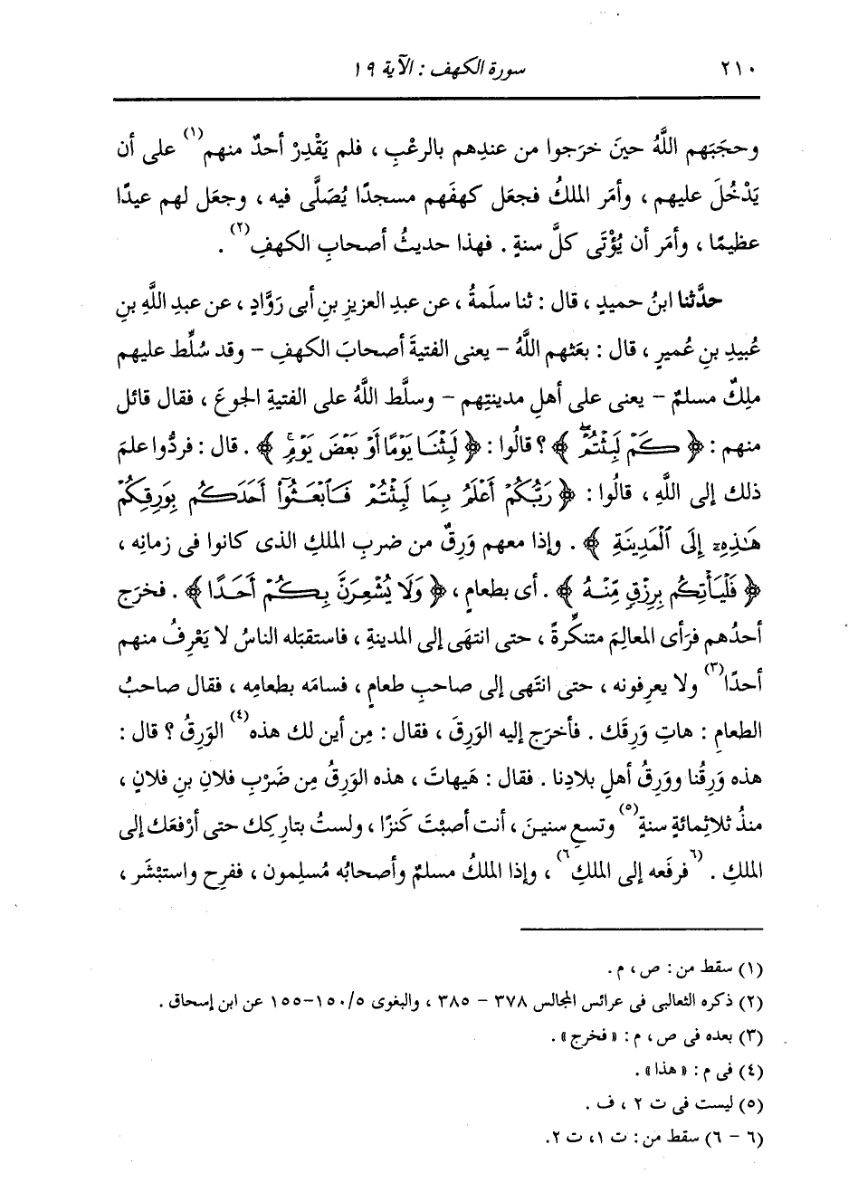 حَدَّثَنَا ابْنُ حُمَيْدٍ، قَالَ: ثنا سَلَمَةُ، عَنْ عَبْدِ الْعَزِيزِ بْنِ أَبِي رَوَّادٍ، عَنْ عَبْدِ اللَّهِ بْنِ عُبَيْدِ بْنِ عُمَيْرٍ، قَالَ: §بَعَثَهُمُ اللَّهُ يَعْنِي الْفِتْيَةَ أَصْحَابَ الْكَهْفِ وَقَدْ سُلِّطَ عَلَيْهِمْ مَلِكٌ مُسْلِمٌ، يَعْنِي عَلَى أَهْلِ مَدِينَتِهِمْ، وَسَلَّطَ اللَّهُ عَلَى الْفِتْيَةِ الْجُوعَ، فَقَالَ قَائِلٌ مِنْهُمْ: {كَمْ لَبِثْتُمْ قَالُوا لَبِثْنَا يَوْمًا أَوْ بَعْضَ يَوْمٍ} [الكهف: 19] قَالَ: فَرَدُّوا عِلْمَ ذَلِكَ إِلَى اللَّهِ {قَالُوا رَبُّكُمْ أَعْلَمْ بِمَا لَبِثْتُمْ فَابْعَثُوا أَحَدُكُمْ بَوَرِقِكُمْ هَذِهِ إِلَى الْمَدِينَةِ} [الكهف: 19] وَإِذَا مَعَهُمْ وَرِقٌ مِنْ ضَرْبِ الْمَلِكِ الَّذِي كَانُوا فِي زَمَانِهِ {فَلْيَأْتِكُمْ بِرِزْقٍ مِنْهُ} [الكهف: 19] أَيْ بِطَعَامٍ {وَلَا يُشْعِرَنَّ بِكُمْ أَحَدًا} [الكهف: 19] فَخَرَجَ أَحَدُهُمْ فَرَأَى الْمَعَالِمَ مُتَنَكِّرَةً حَتَّى انْتَهَى إِلَى الْمَدِينَةِ، فَاسْتَقْبَلَهُ النَّاسُ لَا يَعْرِفُ مِنْهُمْ أَحَدًا، فَخَرَجَ وَلَا يَعْرِفُونَهُ، حَتَّى انْتَهَى إِلَى صَاحِبِ الطَّعَامِ، فَسَامَهُ بِطَعَامِهِ، فَقَالَ صَاحِبُ الطَّعَامِ: هَاتِ وَرِقَكَ، فَأَخْرَجَ إِلَيْهِ الْوَرِقَ، فَقَالَ: مِنْ أَيْنَ لَكَ هَذَا الْوَرِقُ؟ قَالَ: هَذِهِ وَرِقُنَا وَوَرِقُ أَهْلِ بِلَادِنَا فَقَالَ: هَيْهَاتَ هَذِهِ الْوَرِقُ مِنْ ضَرْبِ فُلَانِ بْنِ فُلَانٍ مُنْذُ ثَلَاثِمِائَةٍ وَتِسْعِ سِنِينَ أَنْتَ أَصَبْتَ كَنْزًا، وَلَسْتُ بِتَارِكِكَ حَتَّى أَرْفَعَكَ إِلَى الْمَلِكِ. فَرَفَعَهُ إِلَى الْمَلِكِ، وَإِذَا الْمَلِكُ مُسْلِمٌ وَأَصْحَابُهُ مُسْلِمُونَ، فَفَرِحَ وَاسْتَبْشَرَ، -[211]- وَأَظْهَرَ لَهُمْ أَمْرَهُ، وَأَخْبَرْهُمْ خَبَرَ أَصْحَابِهِ، فَبَعَثُوا إِلَى اللَّوْحِ فِي الْخِزَانَةِ، فَأَتَوْا بِهِ، فَوَافَقَ مَا وُصِفَ مِنْ أَمْرِهِمْ، فَقَالَ الْمُشْرِكُونَ: نَحْنُ أَحَقُّ بِهِمْ هَؤُلَاءِ أَبْنَاءُ آبَائِنَا، وَقَالَ الْمُسْلِمُونَ: نَحْنُ أَحَقُّ بِهِمْ، هُمْ مُسْلِمُونَ مِنَّا. فَانْطَلَقُوا مَعَهُ إِلَى الْكَهْفِ، فَلَمَّا أَتَوْا بَابَ الْكَهْفِ، قَالَ: دَعُونِي حَتَّى أَدْخُلَ عَلَى أَصْحَابِي حَتَّى أُبَشِّرَهُمْ، فَإِنَّهُمْ إِنْ رَأَوْكُمْ مَعِي أَرْعَبْتُمُوهُمْ، فَدَخَلَ فَبَشَّرَهُمْ، وَقَبَضَ اللَّهُ أَرْوَاحَهُمْ. قَالَ: وَعَمَّى اللَّهُ عَلَيْهِمْ مَكَانَهُمْ، فَلَمْ يَهْتَدُوا، فَقَالَ الْمُشْرِكُونَ: نَبْنِي عَلَيْهِمْ بُنْيَانًا، فَإِنَّهُمْ أَبْنَاءُ آبَائِنَا، وَنَعْبُدُ اللَّهَ فِيهَا. وَقَالَ الْمُسْلِمُونَ: نَحْنُ أَحَقُّ بِهِمْ، هُمْ مِنَّا، نَبْنِي عَلَيْهِمْ مَسْجِدًا نُصَلِّي فِيهِ، وَنَعْبُدُ اللَّهَ فِيهِ وَأَوْلَى الْأَقْوَالِ فِي ذَلِكَ بِالصَّوَابِ عِنْدِي قَوْلُ مَنْ قَالَ: إِنَّ اللَّهَ تَعَالَى بَعَثَهُمْ مِنْ رَقْدَتِهِمْ لِيَتَسَاءَلُوا بَيْنَهُمْ كَمَا بَيَّنَّا قَبْلُ، لِأَنَّ اللَّهَ عَزَّ ذِكْرُهُ، كَذَلِكَ أَخْبَرَ عِبَادَهُ فِي كِتَابِهِ، وَإِنَّ اللَّهَ أَعْثَرَ عَلَيْهِمُ الْقَوْمَ الَّذِينَ أَعْثَرَهُمْ عَلَيْهِمْ، لِيَتَحَقَّقَ عِنْدَهُمْ بِبَعْثِ اللَّهِ هَؤُلَاءِ الْفِتْيَةَ مِنْ رَقْدَتِهِمْ بَعْدَ طُولِ مُدَّتِهَا بِهَيْئَتِهِمْ يَوْمَ رَقَدُوا، وَلَمْ يَشِيبُوا عَلَى مَرِّ الْأَيَّامِ وَاللَّيَالِي عَلَيْهِمْ، وَلَمْ يَهْرَمُوا عَلَى كَرِّ الدُّهُورِ وَالْأَزْمَانِ فِيهِمْ قُدْرَتُهُ عَلَى بَعْثِ مَنْ أَمَاتَهُ فِي الدُّنْيَا مِنْ قَبْرِهِ إِلَى مَوْقِفِ الْقِيَامَةِ يَوْمَ الْقِيَامَةِ، لِأَنَّ اللَّهَ عَزَّ ذِكْرُهُ بِذَلِكَ أَخْبَرَنَا، فَقَالَ: {وَكَذَلِكَ أَعْثَرْنَا عَلَيْهِمْ لِيَعْلَمُوا أَنَّ 