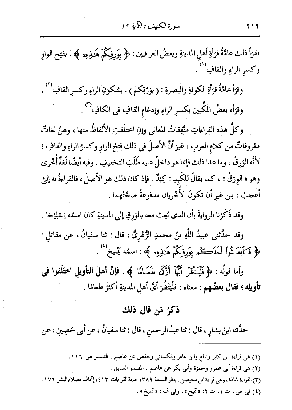 ذِكْرُ مَنْ قَالَ ذَلِكَ: حَدَّثَنَا ابْنُ بَشَّارٍ، قَالَ: ثنا عَبْدُ الرَّحْمَنِ، قَالَ: ثنا سُفْيَانُ، عَنْ أَبِي حُصَيْنٍ، عَنْ -[213]- عِكْرِمَةَ، {§أَيُّهَا أَزْكَى طَعَامًا} [الكهف: 19] قَالَ: أَكْثَرُ وَحَدَّثَنَا الْحَسَنُ، قَالَ: أَخْبَرَنَا عَبْدُ الرَّزَّاقِ، قَالَ: أَخْبَرَنَا الثَّوْرِيُّ، عَنْ أَبِي حَصِينٍ، عَنْ عِكْرِمَةَ مِثْلَهُ، إِلَّا أَنَّهُ قَالَ: أَيُّهُ أَكْثَرُ وَقَالَ آخَرُونَ: بَلْ مَعْنَاهُ: أَيُّهَا أَحَلُّ طَعَامًا