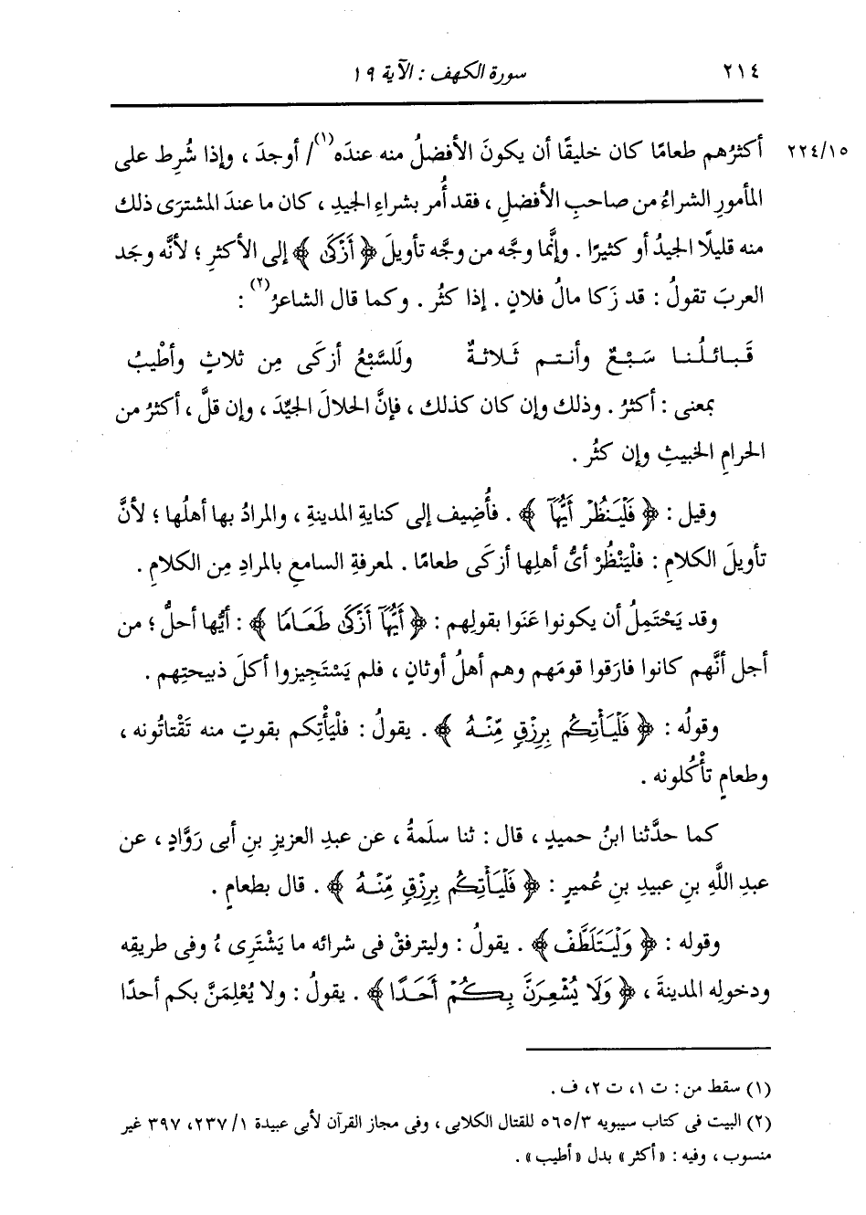 بِمَعْنَى: أَكْثَرُ، وَذَلِكَ وَإِنْ كَانَ كَذَلِكَ، فَإِنَّ الْحَلَالَ الْجَيِّدَ وَإِنَّ قَلَّ أَكْثَرُ مِنَ الْحَرَامِ الْخَبِيثِ وَإِنْ كَثُرَ. وَقِيلَ: {فَلْيَنْظُرْ أَيُّهَا} [الكهف: 19] فَأُضِيفَ إِلَى كِنَايَةِ الْمَدِينَةِ، وَالْمُرَادُ بِهَا أَهْلُهَا، لِأَنَّ تَأْوِيلَ الْكَلَامِ: فَلْيَنْظُرْ أَيَّ أَهْلِهَا أَزْكَى طَعَامًا لِمَعْرِفَةِ السَّامِعِ بِالْمُرَادِ مِنَ الْكَلَامِ. وَقَدْ يَحْتَمِلُ أَنْ يَكُونُوا عَنَوْا بِقَوْلِهِمْ {أَيُّهَا أَزْكَى طَعَامًا} [الكهف: 19] أَيُّهَا أَحَلُّ، مِنْ أَجْلِ أَنَّهُمْ كَانُوا فَارَقُوا قَوْمَهُمْ وَهُمْ أَهْلُ أَوْثَانٍ، فَلَمْ يَسْتَجِيزُوا أَكْلَ ذَبِيحَتِهِمْ