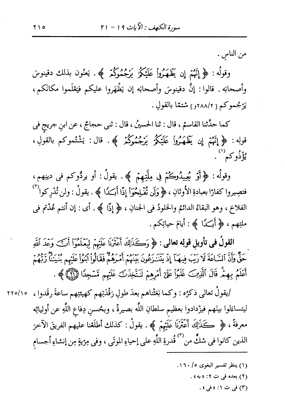 §الْقَوْلُ فِي تَأْوِيلِ قَوْلِهِ تَعَالَى: {وَكَذَلِكَ أَعْثَرْنَا عَلَيْهِمْ لِيَعْلَمُوا أَنَّ وَعْدَ اللَّهِ حَقٌّ وَأَنَّ السَّاعَةَ لَا رَيْبَ فِيهَا إِذْ يَتَنَازَعُونَ بَيْنَهُمْ أَمْرَهُمْ فَقَالُوا ابْنُوا عَلَيْهِمْ بُنْيَانًا رَبُّهُمْ أَعْلَمُ بِهِمْ قَالَ الَّذِينَ غَلَبُوا عَلَى أَمْرِهِمْ لَنَتَّخِذَنَّ عَلَيْهِمْ مَسْجِدًا} [الكهف: 21] يَقُولُ تَعَالَى ذِكْرُهُ: وَكَمَا بَعَثْنَاهُمْ بَعْدَ طُولِ رَقْدَتِهِمْ كَهَيْئَتِهِمْ سَاعَةَ رَقَدُوا، لِيَتَسَاءَلُوا بَيْنَهُمْ، فَيَزْدَادُوا بِعَظِيمِ سُلْطَانِ اللَّهِ بَصِيرَةً، وَبِحُسْنِ دِفَاعِ اللَّهِ عَنْ أَوْلِيَائِهِ مَعْرِفَةً {كَذَلِكَ أَعْثَرْنَا عَلَيْهِمْ} [الكهف: 21] يَقُولُ: كَذَلِكَ أَطْلَعْنَا عَلَيْهِمُ الْفَرِيقَ الْآخَرَ الَّذِينَ كَانُوا فِي شَكٍّ مِنْ قُدْرَةِ اللَّهِ عَلَى إِحْيَاءِ الْمَوْتَى، وَفِي مِرْيَةٍ مِنْ إِنْشَاءِ أَجْسَامِ -[216]- خَلْقِهِ، كَهَيْئَتِهِمْ يَوْمَ قَبَضَهُمْ بَعْدَ الْبِلَى، فَيَعْلَمُوا أَنَّ وَعْدَ اللَّهِ حَقٌّ، وَيُوقِنُوا أَنَّ السَّاعَةَ آتِيَةٌ لَا رَيْبَ فِيهَا. وَبِنَحْوِ الَّذِي قُلْنَا فِي ذَلِكَ، قَالَ أَهْلُ التَّأْوِيلِ