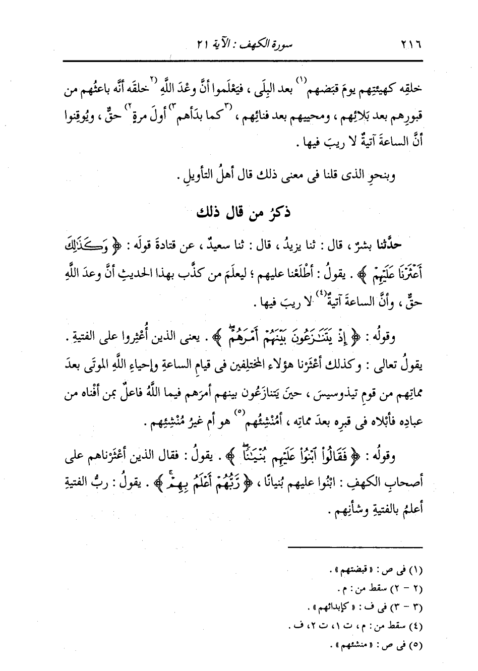 ذِكْرُ مَنْ قَالَ ذَلِكَ: حَدَّثَنَا بِشْرٌ، قَالَ: ثنا يَزِيدُ، قَالَ: ثنا سَعِيدٌ، عَنْ قَتَادَةَ، قَوْلُهُ: {§وَكَذَلِكَ أَعْثَرْنَا عَلَيْهِمْ} [الكهف: 21] يَقُولُ: أَطْلَعْنَا عَلَيْهِمْ لِيَعْلَمَ مَنْ كَذَّبَ بِهَذَا الْحَدِيثِ، أَنَّ وَعْدَ اللَّهِ حَقٌّ، وَأَنَّ السَّاعَةَ لَا رَيْبَ فِيهَا