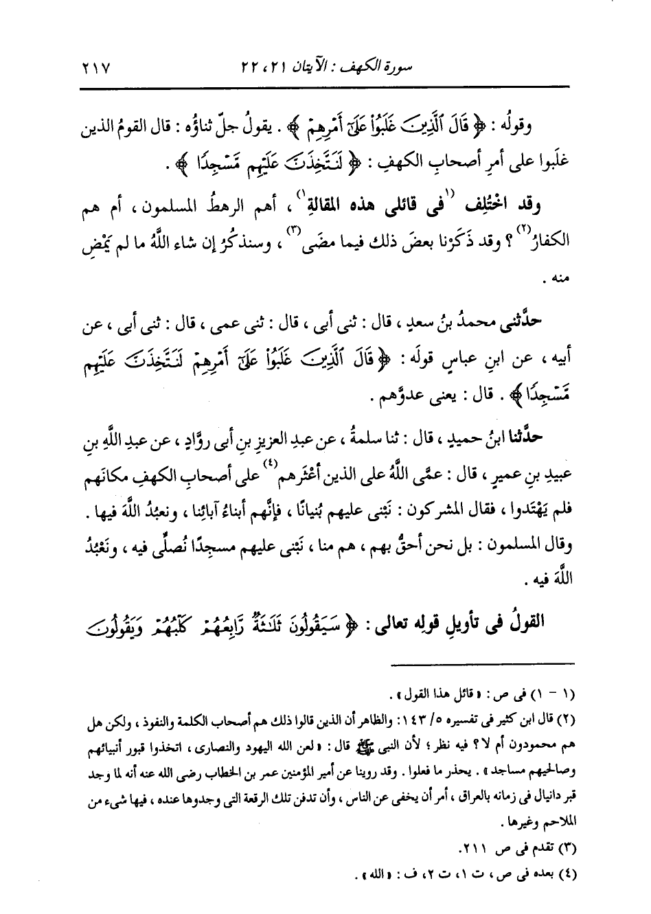 §الْقَوْلُ فِي تَأْوِيلِ قَوْلِهِ تَعَالَى: {سَيَقُولُونَ ثَلَاثَةٌ رَابِعُهُمْ كَلْبِهِمْ وَيَقُولُونَ -[218]- خَمْسَةٌ سَادِسُهُمْ كَلْبِهِمْ رَجْمًا بِالْغَيْبِ وَيَقُولُونَ سَبْعَةٌ وَثَامِنُهُمْ كَلْبُهُمْ قُلْ رَبِّي أَعْلَمُ بِعِدَّتِهِمْ مَّا يَعْلَمُهُمْ إِلَّا قَلِيلٌ فَلَا تُمَارِ فِيهِمْ إِلَّا مِرَاءً ظَاهِرًا وَلَا تَسْتَفْتِ فِيهِمْ مِنْهُمْ أَحَدًا} [الكهف: 22] يَقُولُ تَعَالَى ذِكْرُهُ: سَيَقُولُ بَعْضُ الْخَائِضِينَ فِي أَمْرِ الْفِتْيَةِ مِنْ أَصْحَابِ الْكَهْفِ، هُمْ ثَلَاثَةٌ رَابِعُهُمْ كَلْبُهُمْ، وَيَقُولُ بَعْضُهُمْ: هُمْ خَمْسَةٌ سَادِسُهُمْ كَلْبُهُمْ {رَجْمًا بِالْغَيْبِ} [الكهف: 22] يَقُولُ: قَذْفًا بِالظَّنِّ غَيْرَ يَقِينِ عِلْمٍ، كَمَا قَالَ الشَّاعِرُ: