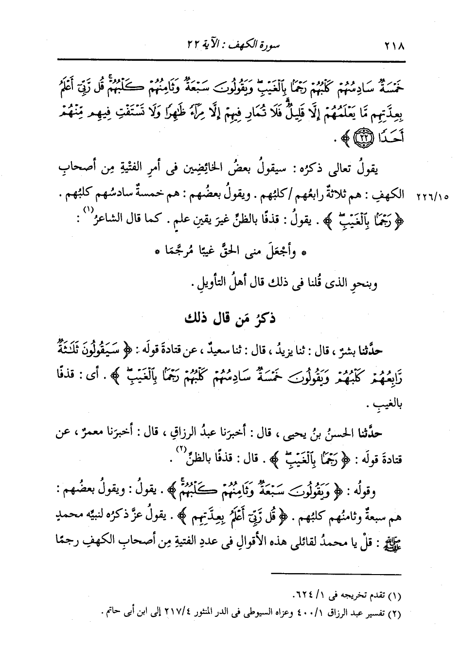 ذِكْرُ مَنْ قَالَ ذَلِكَ: حَدَّثَنَا بِشْرٌ، قَالَ: ثنا يَزِيدُ، قَالَ: ثنا سَعِيدٌ، عَنْ قَتَادَةَ، قَوْلُهُ: {§سَيَقُولُونَ ثَلَاثَةٌ رَابِعُهُمْ كَلْبُهُمْ وَيَقُولُونَ خَمْسَةٌ سَادِسُهُمْ كَلْبُهُمْ رَجْمًا بِالْغَيْبِ} [الكهف: 22] أَيْ قَذْفًا بِالْغَيْبِ
