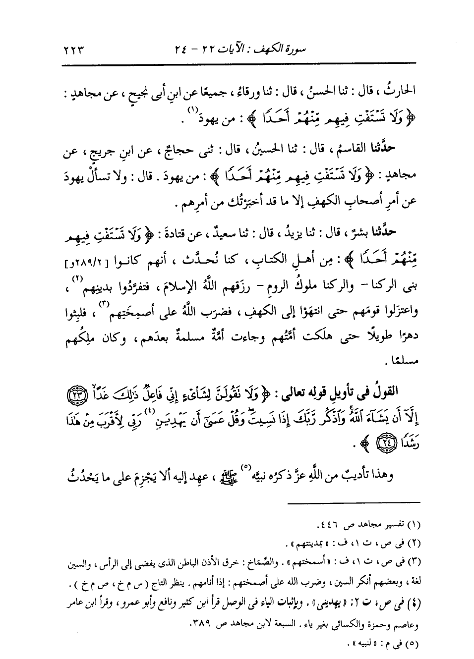 حَدَّثَنَا الْقَاسِمُ، قَالَ: ثنا الْحُسَيْنُ، قَالَ: ثني حَجَّاجٌ، عَنِ ابْنِ جُرَيْجٍ، عَنْ مُجَاهِدٍ {§وَلَا تَسْتَفْتِ فِيهِمْ مِنْهُمْ أَحَدًا} [الكهف: 22] مِنْ يَهُودَ، قَالَ: وَلَا تَسْأَلْ يَهُودَ عَنْ أَمْرِ أَصْحَابِ الْكَهْفِ، إِلَّا مَا قَدْ أَخْبَرْتُكَ مِنْ أَمْرِهِمْ