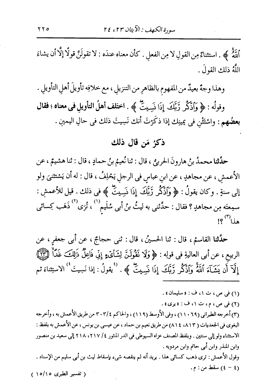 ذِكْرُ مَنْ قَالَ ذَلِكَ: حَدَّثَنَا مُحَمَّدُ بْنُ هَارُونَ الْحَرْبِيُّ، قَالَ: ثنا نُعَيْمُ بْنُ حَمَّادٍ، قَالَ: ثنا هُشَيْمٌ، عَنِ الْأَعْمَشِ، عَنْ مُجَاهِدٍ، عَنِ ابْنِ عَبَّاسٍ، §فِي الرَّجُلِ يَحْلِفُ، قَالَ لَهُ: أَنْ يَسْتَثْنِيَ وَلَوْ إِلَى سَنَةٍ، وَكَانَ يَقُولُ: {وَاذْكُرْ رَبَّكَ إِذَا نَسِيتَ} [الكهف: 24] فِي ذَلِكَ قِيلَ لِلْأَعْمَشِ سَمِعْتُهُ مِنْ مُجَاهِدٍ، فَقَالَ: ثني بِهِ لَيْثُ بْنُ أَبِي سُلَيْمٍ، يَرَى ذَهَبَ كِسَائِي هَذَا