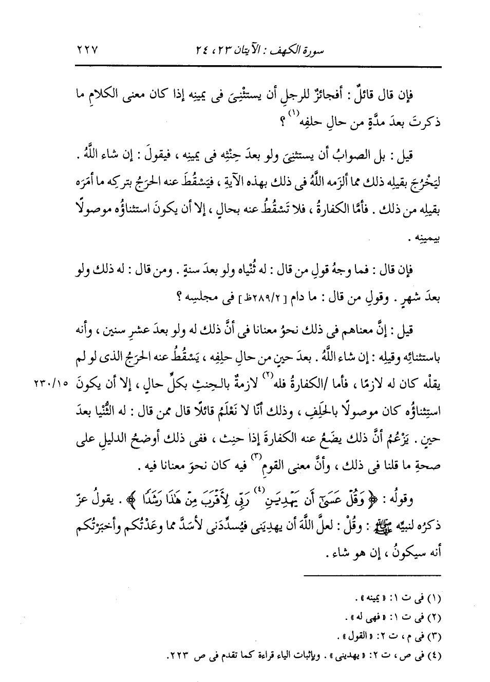 فَإِنْ قَالَ قَائِلٌ: أَفَجَائِزٌ لِلرَّجُلِ أَنْ يَسْتَثْنِيَ فِي يَمِينِهِ إِذْ كَانَ مَعْنَى الْكَلَامِ مَا ذَكَرْتُ بَعْدَ مُدَّةٍ مِنْ حَالِ حَلِفِهِ؟ قِيلَ: بَلِ الصَّوَابُ أَنْ يَسْتَثْنِيَ وَلَوْ بَعْدَ حِنْثِهِ فِي يَمِينِهِ، فَيَقُولُ: إِنْ شَاءَ اللَّهُ لِيَخْرُجَ بِقِيلِهِ ذَلِكَ مِمَّا أَلْزَمَهُ اللَّهُ فِي ذَلِكَ بِهَذِهِ الْآيَةِ، فَيَسْقُطُ عَنْهُ الْحَرَجُ بِتَرْكِهِ مَا أَمَرَهُ بِقِيلِهِ مِنْ ذَلِكَ، فَأَمَّا الْكَفَّارَةُ فَلَا تَسْقُطُ عَنْهُ بِحَالٍ، إِلَّا أَنْ يَكُونَ اسْتِثْنَاؤُهُ مَوْصُولًا بِيَمِينِهِ. فَإِنْ قَالَ: فَمَا وَجْهُ قَوْلِ مَنْ قَالَ: لَهُ ثُنْيَاهُ وَلَوْ بَعْدَ سَنَةٍ، وَمَنْ قَالَ: لَهُ ذَلِكَ وَلَوْ بَعْدَ شَهْرٍ، وَقَوْلُ مَنْ قَالَ: مَا دَامَ فِي مَجْلِسِهِ؟ قِيلَ: إِنَّ مَعْنَاهُمْ فِي ذَلِكَ نَحْوُ مَعْنَانَا فِي أَنَّ ذَلِكَ لَهُ، وَلَوْ بَعْدَ عَشْرِ سِنِينَ، وَأَنَّهُ بِاسْتِثْنَائِهِ وَقِيلِهِ إِنْ شَاءَ اللَّهُ بَعْدَ حِينٍ مِنْ حَالِ حَلِفِهِ، يَسْقُطُ عَنْهُ الْحَرَجُ الَّذِي لَوْ لَمْ يَقُلْهُ كَانَ لَهُ لَازِمًا، فَأَمَّا الْكَفَّارَةُ فَلَهُ لَازِمَةٌ بِالْحِنْثِ بِكُلِّ حَالٍ، إِلَّا أَنْ يَكُونَ اسْتِثْنَاؤُهُ كَانَ مَوْصُولًا بِالْحَلِفِ، وَذَلِكَ أَنَّا لَا نَعْلَمُ قَائِلًا قَالَ مِمَّنْ قَالَ لَهُ الثُّنْيَا بَعْدَ حِينٍ يَزْعُمُ أَنَّ ذَلِكَ يَضَعُ عَنْهُ الْكَفَّارَةَ إِذَا حَنِثَ، فَفِي ذَلِكَ أَوْضَحُ الدَّلِيلِ عَلَى صِحَّةِ مَا قُلْنَا فِي ذَلِكَ، وَأَنَّ مَعْنَى الْقَوْلِ فِيهِ، كَانَ نَحْوَ مَعْنَانَا فِيهِ