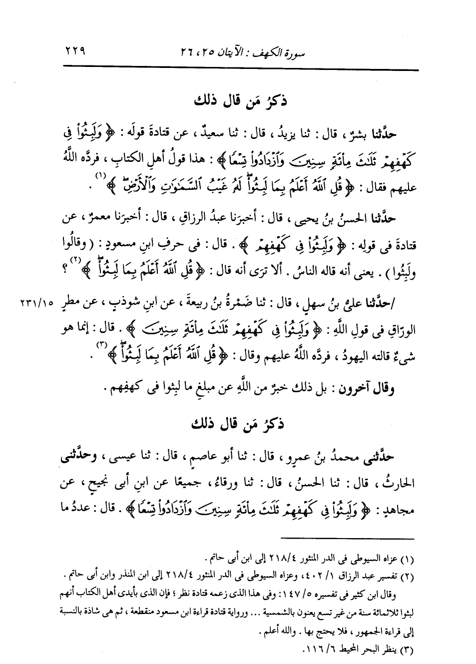 حَدَّثَنَا عَلِيُّ بْنُ سَهْلٍ، قَالَ: ثنا ضَمْرَةُ بْنُ رَبِيعَةَ، عَنِ ابْنِ شَوْذَبٍ، عَنْ مَطَرٍ الْوَرَّاقِ، فِي قَوْلِ اللَّهِ: {§وَلَبِثُوا فِي كَهْفِهِمْ ثَلَاثَ مِائَةٍ سِنِينَ} [الكهف: 25] قَالَ: إِنَّمَا هُوَ شَيْءٌ قَالَتْهُ الْيَهُودُ، فَرَدَّهُ اللَّهُ عَلَيْهِمْ وَقَالَ: {قُلِ اللَّهُ أَعْلَمُ بِمَا لَبِثُوا} [الكهف: 26] وَقَالَ آخَرُونَ: بَلْ ذَلِكَ خَبَرٌ مِنَ اللَّهِ عَنْ مَبْلَغِ مَا لَبِثُوا فِي كَهْفِهِمْ