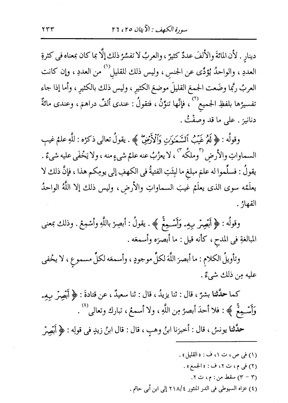 §وَقَوْلُهُ: {أَبْصِرْ بِهِ وَأَسْمِعْ} [الكهف: 26] يَقُولُ: أَبْصِرْ بِاللَّهِ وَأَسْمِعْ، وَذَلِكَ بِمَعْنَى الْمُبَالَغَةِ فِي الْمَدْحِ، كَأَنَّهُ قِيلَ: مَا أَبْصَرَهُ وَأَسْمَعَهُ. وَتَأْوِيلُ الْكَلَامِ: مَا أَبْصَرَ اللَّهَ لِكُلِّ مَوْجُودٍ، وَأَسْمَعَهُ لِكُلِّ مَسْمُوعٍ، لَا يَخْفَى عَلَيْهِ مِنْ ذَلِكَ شَيْءٌ، كَمَا: