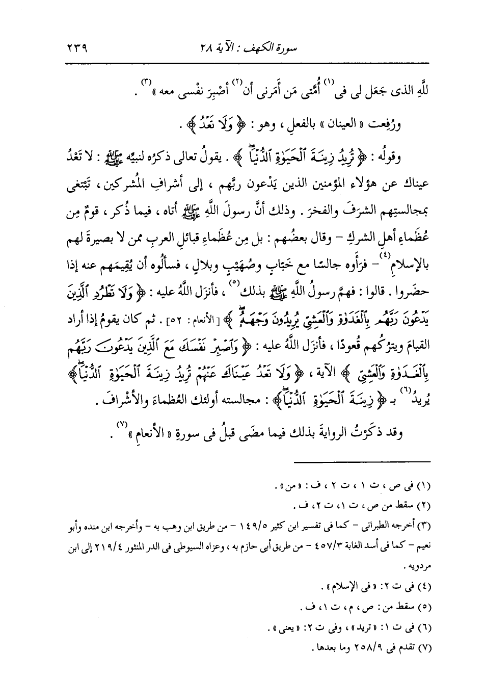 §وَقَوْلُهُ: {تُرِيدُ زِينَةَ الْحَيَاةِ الدُّنْيَا} [الكهف: 28] يَقُولُ تَعَالَى ذِكْرُهُ لِنَبِيِّهِ صَلَّى اللهُ عَلَيْهِ وَسَلَّمَ: لَا تَعْدُ عَيْنَاكَ عَنْ هَؤُلَاءِ الْمُؤْمِنِينَ الَّذِينَ يَدْعُونَ رَبَّهُمْ إِلَى أَشْرَافِ الْمُشْرِكِينَ، تَبْغِي بِمُجَالَسَتِهِمُ الشَّرَفَ وَالْفَخْرَ، وَذَلِكَ أَنَّ رَسُولَ اللَّهِ صَلَّى اللهُ عَلَيْهِ وَسَلَّمَ أَتَاهُ فِيمَا ذُكِرَ قَوْمٌ مِنْ عُظَمَاءِ أَهْلِ الشِّرْكِ، وَقَالَ بَعْضُهُمْ: بَلْ مِنْ عُظَمَاءِ قَبَائِلِ الْعَرَبِ مِمَّنْ لَا بَصِيرَةَ لَهُمْ بِالْإِسْلَامِ، فَرَأَوْهُ جَالِسًا مَعَ خَبَّابٍ وَصُهَيْبٍ وَبِلَالٍ، فَسَأَلُوهُ أَنْ يُقِيمَهُمْ عَنْهُ إِذَا حَضَرُوا، قَالُوا: فَهَمَّ رَسُولُ اللَّهِ صَلَّى اللهُ عَلَيْهِ وَسَلَّمَ، فَأَنْزَلَ اللَّهُ عَلَيْهِ: {وَلَا تَطْرُدِ الَّذِينَ يَدْعُونَ رَبَّهُمْ بِالْغَدَاةِ وَالْعَشِيِّ يُرِيدُونَ وَجْهَهُ} [الأنعام: 52] ثُمَّ كَانَ يَقُومُ إِذَا أَرَادَ الْقِيَامَ، وَيَتْرُكُهُمْ قُعُودًا، فَأَنْزَلَ اللَّهُ عَلَيْهِ {وَاصْبِرْ نَفْسَكَ مَعَ الَّذِينَ يَدْعُونَ رَبَّهُمْ بِالْغَدَاةِ وَالْعَشِيِّ} [الكهف: 28] . الْآيَةَ {وَلَا تَعْدُ عَيْنَاكَ عَنْهُمْ تُرِيدُ زِينَةَ الْحَيَاةِ الدُّنْيَا} [الكهف: 28] يُرِيدُ زِينَةَ الْحَيَاةِ الدُّنْيَا: مُجَالَسَةَ أُولَئِكَ الْعُظَمَاءِ الْأَشْرَافِ، وَقَدْ ذَكَرْتُ الرِّوَايَةَ بِذَلِكَ فِيمَا مَضَى قَبْلُ فِي سُورَةِ الْأَنْعَامِ