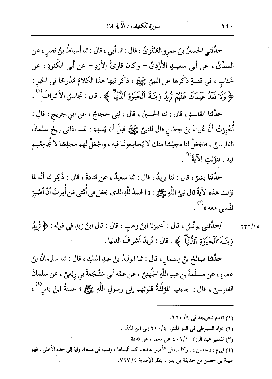 حَدَّثَنَا الْقَاسِمُ، قَالَ: ثنا الْحُسَيْنُ، قَالَ: ثني حَجَّاجٌ، عَنِ ابْنِ جُرَيْجٍ، قَالَ: أُخْبِرْتُ أَنَّ §عُيَيْنَةَ بْنَ حِصْنٍ قَالَ لِلنَّبِيِّ صَلَّى اللهُ عَلَيْهِ وَسَلَّمَ قَبْلَ أَنْ يُسْلِمَ: لَقَدْ آذَانِي رِيحُ سَلْمَانَ الْفَارِسِيِّ، فَاجْعَلْ لَنَا مَجْلِسًا مِنْكَ لَا يُجَامِعُونَنَا فِيهِ، وَاجْعَلْ لَهُمْ مَجْلِسًا لَا نجامعهمُ فِيهِ، فَنَزَلَتِ الْآيَةُ