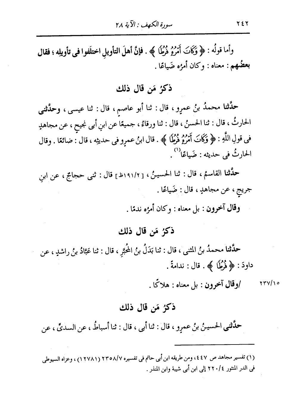 ذِكْرُ مَنْ قَالَ ذَلِكَ: حَدَّثَنَا مُحَمَّدُ بْنُ عَمْرٍو، قَالَ: ثنا أَبُو عَاصِمٍ، قَالَ: ثنا عِيسَى، وَحَدَّثَنِي الْحَارِثُ، قَالَ: ثنا الْحَسَنُ، قَالَ ثنا وَرْقَاءُ، جَمِيعًا عَنِ ابْنِ أَبِي نَجِيحٍ، عَنْ مُجَاهِدٍ، فِي قَوْلِ اللَّهِ: {§وَكَانَ أَمْرُهُ فُرُطًا} [الكهف: 28] قَالَ ابْنُ عَمْرِو فِي حَدِيثِهِ قَالَ: ضَائِعًا. وَقَالَ الْحَارِثُ فِي حَدِيثِهِ: ضَيَاعًا