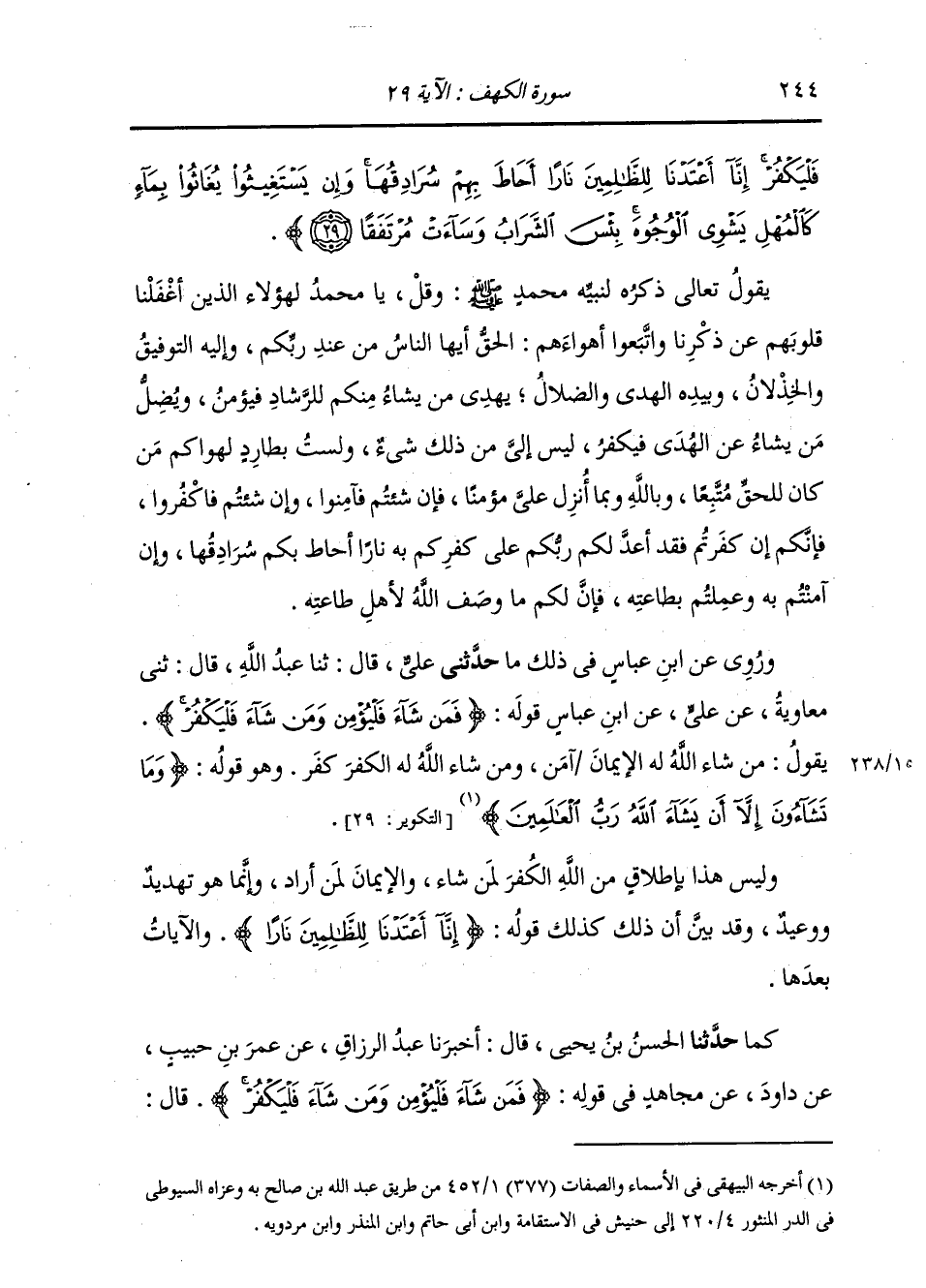 حَدَّثَنِي عَلِيٌّ، قَالَ: ثنا عَبْدُ اللَّهِ، قَالَ: ثني مُعَاوِيَةُ، عَنْ عَلِيٍّ، عَنِ ابْنِ عَبَّاسٍ، قَوْلُهُ: {§فَمَنْ شَاءَ فَلْيُؤْمِنْ وَمَنْ شَاءَ فَلْيَكْفُرْ} [الكهف: 29] يَقُولُ: مَنْ شَاءَ اللَّهُ لَهُ الْإِيمَانُ آمَنَ، وَمَنْ شَاءَ اللَّهُ لَهُ الْكُفْرَ كَفَرَ، وَهُوَ قَوْلُهُ: {وَمَا تَشَاءُونَ إِلَّا أَنْ يَشَاءَ اللَّهُ رَبُّ الْعَالَمِينَ} وَلَيْسَ هَذَا بِإِطْلَاقٍ مِنَ اللَّهِ الْكُفْرَ لِمَنْ شَاءَ، وَالْإِيمَانَ لِمَنْ أَرَادَ، وَإِنَّمَا هُوَ تَهْدِيدٌ وَوَعِيدٌ وَقَدْ بَيَّنَ أَنَّ ذَلِكَ كَذَلِكَ قَوْلُهُ: {إِنَّا أَعْتَدْنَا لِلظَّالِمِينَ نَارًا} [الكهف: 29] وَالْآيَاتُ بَعْدَهَا. كَمَا: