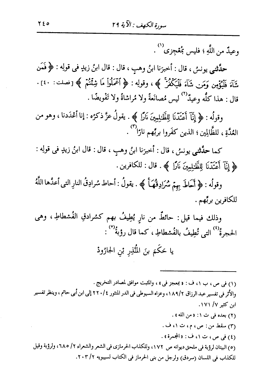 حَدَّثَنِي يُونُسُ، قَالَ: أَخْبَرَنَا ابْنُ وَهْبٍ، قَالَ: قَالَ ابْنُ زَيْدٍ، فِي قَوْلِهِ: {§إِنَّا أَعْتَدْنَا لِلظَّالِمِينَ نَارًا أَحَاطَ بِهِمْ سُرَادِقُهَا} [الكهف: 29] قَالَ: لِلْكَافِرِينَ