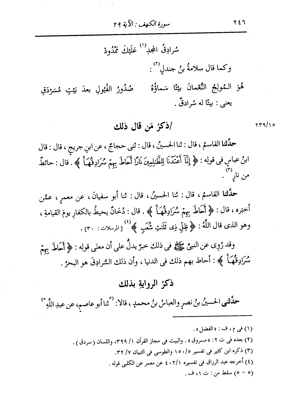حَدَّثَنَا الْقَاسِمُ، قَالَ: ثنا الْحُسَيْنُ، قَالَ: ثنا أَبُو سُفْيَانَ، عَنْ مَعْمَرٍ، عَمَّنْ أَخْبَرَهُ قَالَ {§أَحَاطَ بِهِمْ سُرَادِقُهَا} [الكهف: 29] قَالَ: دُخَانٌ يُحِيطُ بِالْكُفَّارِ يَوْمَ الْقِيَامَةِ، وَهُوَ الَّذِي قَالَ اللَّهُ: {ظِلٍّ ذِي ثَلَاثِ شَعُبٍ} [المرسلات: 30] وَقَدْ رُوِيَ عَنِ النَّبِيِّ صَلَّى اللهُ عَلَيْهِ وَسَلَّمَ فِي ذَلِكَ خَبَرٌ يَدُلُّ عَلَى أَنَّ مَعْنَى قَوْلِهِ {أَحَاطَ بِهِمْ سُرَادِقُهَا} [الكهف: 29] أَحَاطَ بِهِمْ ذَلِكَ فِي الدُّنْيَا، وَأَنَّ ذَلِكَ السُّرَادِقُ هُوَ الْبَحْرُ