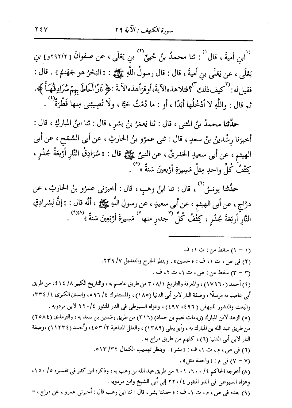 حَدَّثَنَا مُحَمَّدُ بْنُ الْمُثَنَّى، قَالَ: ثنا يَعْمَرُ بْنُ بِشْرٍ، قَالَ: ثنا ابْنُ الْمُبَارَكِ، قَالَ: أَخْبَرَنَا رِشْدِينُ بْنُ سَعْدٍ، قَالَ: ثني عَمْرِو بْنِ الْحَارِثِ، عَنْ أَبِي السَّمْحِ، عَنْ أَبِي الْهَيْثَمِ، عَنْ أَبِي سَعِيدٍ الْخُدْرِيِّ، عَنِ النَّبِيِّ صَلَّى اللهُ عَلَيْهِ وَسَلَّمَ قَالَ: «§سُرَادِقُ النَّارِ أَرْبَعَةُ جُدُرٍ، كِثَفُ كُلِّ وَاحِدٍ مِثْلَ مَسِيرَةِ أَرْبَعِينَ سَنَةً»