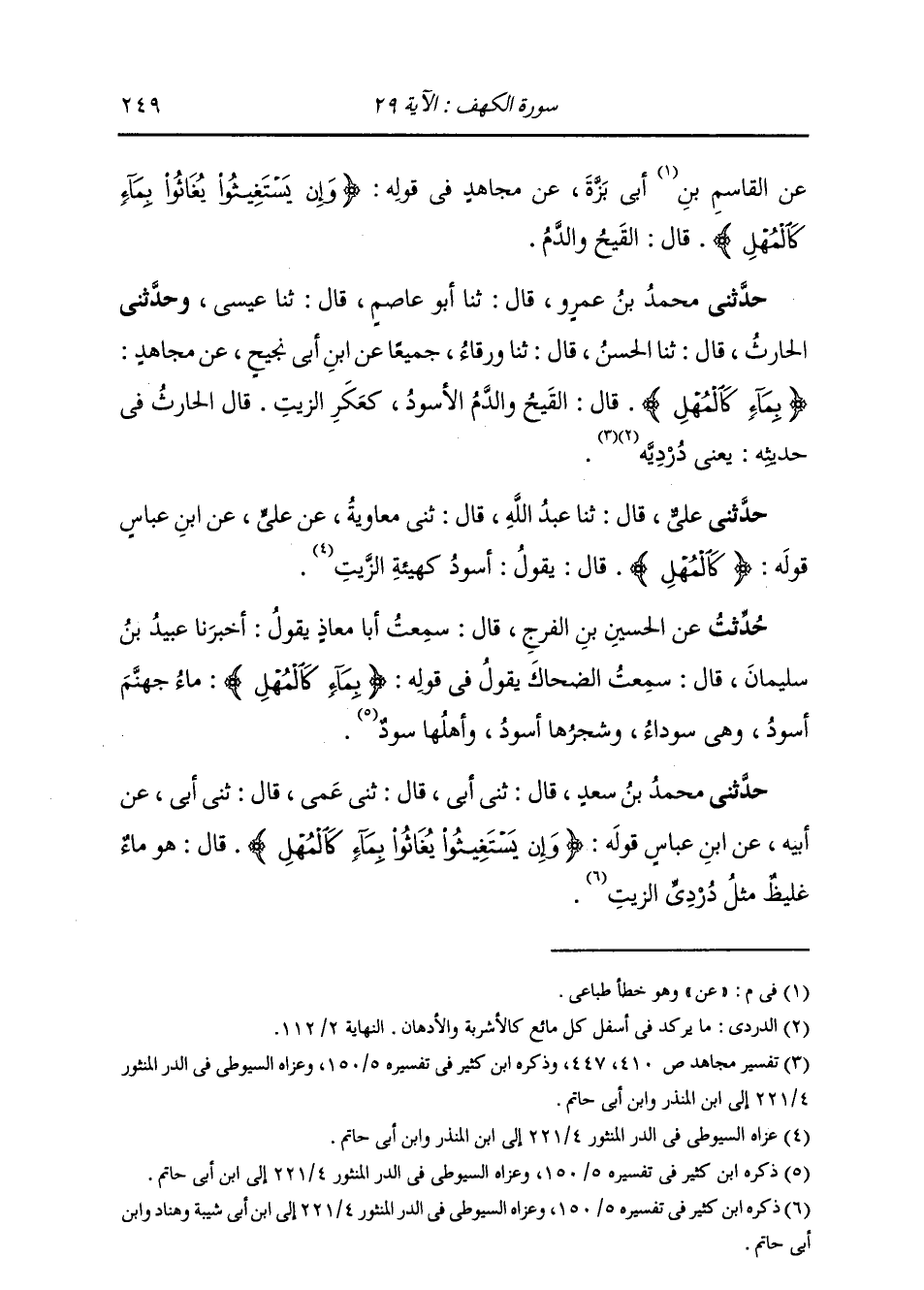 حَدَّثَنِي مُحَمَّدُ بْنُ سَعْدٍ، قَالَ ثني أَبِي، قَالَ: ثني عَمِّي، قَالَ ثني أَبِي، عَنْ أَبِيهِ، عَنِ ابْنِ عَبَّاسٍ، قَوْلُهُ {§وَإِنْ يَسْتَغِيثُوا يُغَاثُوا بِمَاءٍ كَالْمُهْلِ} [الكهف: 29] قَالَ: هُوَ مَاءٌ غَلِيظٌ مِثْلُ دُرْدِيِّ الزَّيْتِ