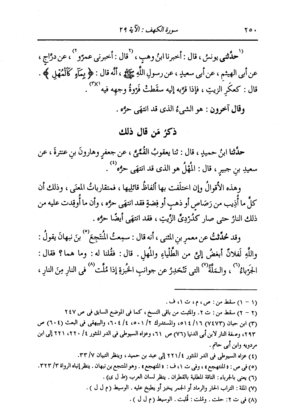ذِكْرُ مَنْ قَالَ ذَلِكَ: حَدَّثَنَا ابْنُ حُمَيْدٍ، قَالَ: ثنا يَعْقُوبُ الْقُمِّيُّ، عَنْ جَعْفَرٍ، وَهَارُونُ بْنُ عَنْتَرَةَ، عَنْ سَعِيدِ بْنِ جُبَيْرٍ، قَالَ: §الْمُهْلُ: هُوَ الَّذِي قَدِ انْتَهَى حَرُّهُ وَهَذِهِ الْأَقْوَالُ وَإِنِ اخْتَلَفَتْ بِهَا أَلْفَاظُ قَائِلِيهَا، فَمُتَقَارِبَاتُ الْمَعْنَى، وَذَلِكَ أَنَّ كُلَّ مَا أُذِيبَ مِنْ رَصَاصِ أَوْ ذَهَبٍ أَوْ فِضَّةٍ فَقَدِ انْتَهَى حَرُّهُ، وَأَنَّ مَا أُوقِدَتْ عَلَيْهِ مِنْ ذَلِكَ النَّارُ حَتَّى صَارَ كَدُرْدِيِّ الزَّيْتِ، فَقَدِ انْتَهَى أَيْضًا حَرُّهُ. وَقَدْ: