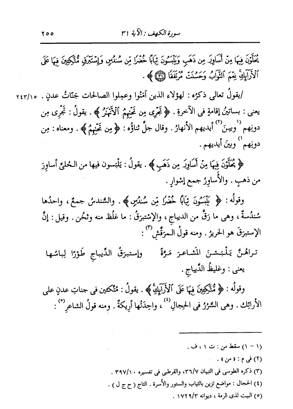 يُحَلَّوْنَ فِيهَا مِنْ أَسَاوِرَ مِنْ ذَهَبٍ وَيَلْبَسُونَ ثِيَابًا خُضْرًا مِنْ سُنْدُسٍ وَإِسْتَبْرَقٍ مُتَّكِئِينَ فِيهَا عَلَى الْأَرَائِكِ نِعْمَ الثَّوَابُ وَحَسُنَتْ مُرْتَفَقًا} [الكهف: 31] يَقُولُ تَعَالَى ذِكْرُهُ: لِهَؤُلَاءِ الَّذِينَ آمَنُوا وَعَمِلُوا الصَّالِحَاتِ جَنَّاتُ عَدْنٍ، يَعْنِي بَسَاتِينَ إِقَامَةٍ فِي الْآخِرَةِ. {تَجْرِي مِنْ تَحْتَهُمُ الْأَنْهَارُ} [الأعراف: 43] يَقُولُ: تَجْرِي مِنْ دُونِهِمْ وَمِنْ أَيْدِيهِمُ الْأَنْهَارُ. وَقَالَ جَلَّ ثَنَاؤُهُ: {مِنْ تَحْتِهِمْ} [الأنعام: 6] وَمَعْنَاهُ: مِنْ دُونِهِمْ وَبَيْنَ أَيْدِيهِمْ {يُحَلَّوْنَ فِيهَا مِنْ أَسَاوِرَ} [الكهف: 31] يَقُولُ: يَلْبَسُونَ فِيهَا مِنَ الْحُلِيِّ أَسَاوِرَ مِنْ ذَهَبٍ، وَالْأَسَاوِرُ: جَمْعُ إِسْوَارٍ. وَقَوْلُهُ: {وَيَلْبَسُونَ ثِيَابًا خُضْرًا مِنْ سُنْدُسِ} [الكهف: 31] وَالسُّنْدُسُ: جَمْعٌ وَاحِدُهَا سُنْدُسَةٌ، وَهِيَ مَا رَقَّ مِنَ الدِّيبَاجِ. وَالْإِسْتَبْرَقُ: مَا غَلُظَ مِنْهُ وَثَخُنَ، وَقِيلَ: إِنَّ الْإِسْتَبْرَقَ: هُوَ الْحَرِيرُ، وَمِنْهُ قَوْلُ الْمُرَقَّشِ: