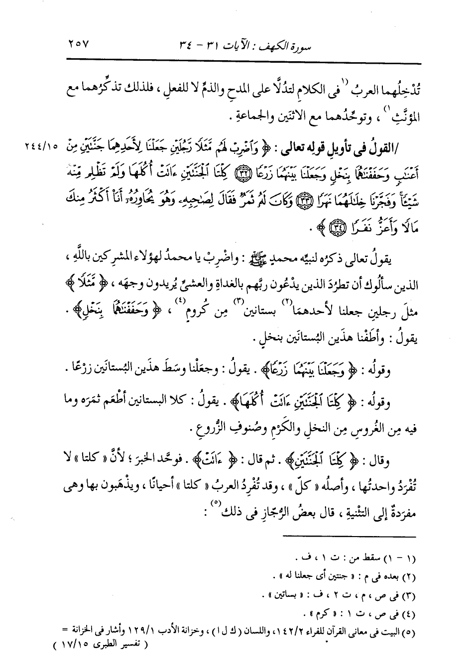 §الْقَوْلُ فِي تَأْوِيلِ قَوْلِهِ تَعَالَى: {وَاضْرِبْ لَهُمْ مَثَلًا رَجُلَيْنِ جَعَلْنَا لِأَحَدِهِمَا جَنَّتَيْنِ مِنْ أَعْنَابِ وَحَفَفْنَاهُمَا بِنَخْلٍ وَجَعَلْنَا بَيْنَهُمَا زَرْعًا كِلْتَا الْجَنَّتَيْنِ آتَتْ أُكُلَهَا وَلَمْ تَظْلِمْ مِنْهُ شَيْئًا وَفَجَّرْنَا خِلَالَهُمَا نَهَرًا وَكَانَ لَهُ ثَمَرٌ فَقَالَ لِصَاحِبِهِ وَهُوَ يُحَاوِرُهُ أَنَا أَكْثَرُ مِنْكَ مَالًا وَأَعَزُّ نَفَرًا} [الكهف: 33] يَقُولُ تَعَالَى ذِكْرُهُ لِنَبِيِّهِ مُحَمَّدٍ صَلَّى اللهُ عَلَيْهِ وَسَلَّمَ: وَاضْرِبْ يَا مُحَمَّدُ لِهَؤُلَاءِ الْمُشْرِكِينَ بِاللَّهِ، الَّذِينَ سَأَلُوكَ أَنْ تَطْرُدَ الَّذِينَ يَدْعُونَ رَبَّهُمْ بِالْغَدَاةِ وَالْعَشِيِّ يُرِيدُونَ وَجْهَهُ مَثَلًا مِثْلُ {رَجُلَيْنِ جَعَلْنَا لِأَحَدِهِمَا جَنَّتَيْنِ} [الكهف: 32] أَيْ جَعَلْنَا لَهُ بُسْتَانَيْنِ مِنْ كُرُومٍ {وَحَفَفْنَاهُمَا بِنَخْلٍ} [الكهف: 32] يَقُولُ: وَأَطَفْنَا هَذَيْنِ الْبُسْتَانَيْنِ بِنَخْلٍ. وَقَوْلُهُ: {وَجَعَلْنَا بَيْنَهُمَا زَرْعًا} [الكهف: 32] يَقُولُ: وَجَعَلْنَا وَسَطَ هَذَيْنِ الْبُسْتَانَيْنِ زَرْعًا. وَقَوْلُهُ: {كِلْتَا الْجَنَّتَيْنِ آتَتْ أُكُلَهَا} [الكهف: 33] يَقُولُ: كِلَا الْبُسْتَانَيْنِ أَطْعَمَ ثَمَرُهُ وَمَا فِيهِ مِنَ الْغُرُوسِ مِنَ النَّخْلِ وَالْكَرْمِ وَصُنُوفِ الزَّرْعِ. وَقَالَ: كِلْتَا الْجَنَّتَيْنِ، ثُمَّ قَالَ: آتَتْ، فَوَحَّدَ الْخَبَرَ، لِأَنَّ كِلْتَا لَا يُفْرَدُ وَاحِدَتُهَا، وَأَصْلُهُ كُلٌّ، وَقَدْ تَفْرِدُ الْعَرَبُ كِلْتَا أَحْيَانًا، وَيَذْهَبُونَ بِهَا وَهِيَ مُفْرَدَةٌ إِلَى التَّثْنِيَةِ، قَالَ بَعْضُ الرُّجَّازِ فِي ذَلِكَ: