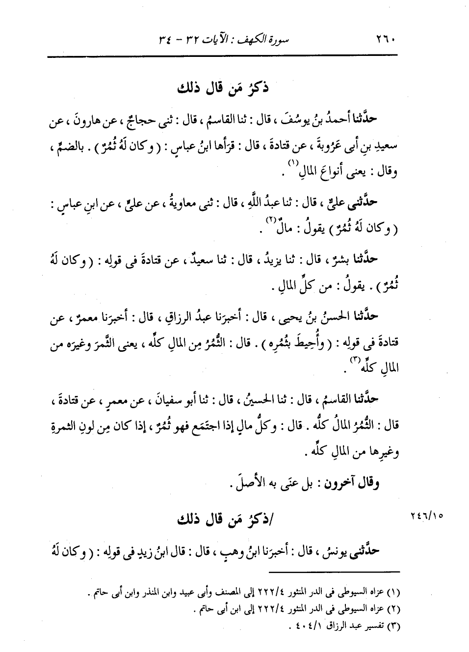 حَدَّثَنَا الْقَاسِمُ، قَالَ: ثنا الْحُسَيْنُ، قَالَ: ثنا أَبُو سُفْيَانَ، عَنْ مَعْمَرٍ، عَنْ قَتَادَةَ، قَالَ: «§الثَّمَرُ» الْمَالُ كُلُّهُ، قَالَ: وَكُلُّ مَالٍ إِذَا اجْتَمَعَ فَهُوَ ثَمَرٌ إِذَا كَانَ مِنْ لَوْنِ الثَّمَرَةِ وَغَيْرِهَا مِنَ الْمَالِ كُلُّهُ. وَقَالَ آخَرُونَ: بَلْ عَنَى بِهِ الْأَصْلَ