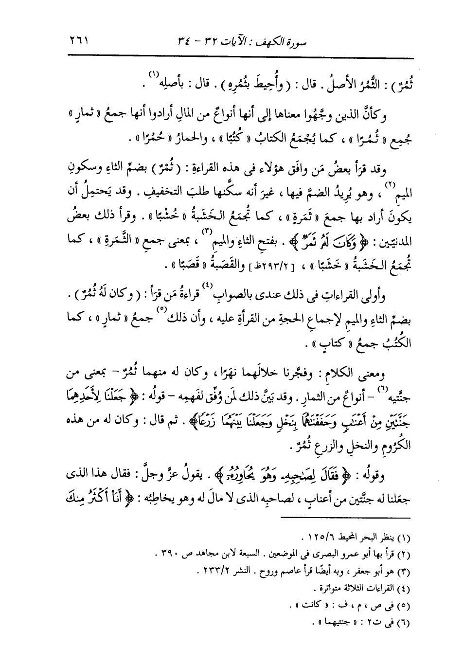 ثُمُرٌ» الثُّمُرُ الْأَصْلُ. قَالَ {وَأُحِيطَ بِثَمَرِهِ} [الكهف: 42] قَالَ: بِأَصْلِهِ وَكَأَنَّ الَّذِينَ وَجَّهُوا مَعْنَاهَا إِلَى أَنَّهَا أَنْوَاعٌ مِنَ الْمَالِ، أَرَادُوا أَنَّهَا جَمْعُ ثِمَارٍ جَمْعُ ثُمُرٍ، كَمَا يُجْمَعُ الْكِتَابُ كُتَبًا، وَالْحِمَارُ حُمُرًا. وَقَدْ قَرَأَ بَعْضُ مَنْ وَافَقَ هَؤُلَاءِ فِي هَذِهِ الْقِرَاءَةِ «ثُمُرٌ» بِضَمِّ الثَّاءِ وَسُكُونِ الْمِيمِ، وَهُوَ يُرِيدُ الضَّمَّ فِيهَا غَيْرَ أَنَّهُ سَكَّنَهَا طَلَبَ التَّخْفِيفِ. وَقَدْ يَحْتَمِلُ أَنْ يَكُونَ أَرَادَ بِهَا جَمْعَ ثَمَرَةٍ، كَمَا تُجْمَعُ الْخَشَبَةُ خَشَبًا. وَقَرَأَ ذَلِكَ بَعْضُ الْمَدَنِيِّينَ: {وَكَانَ لَهُ ثَمَرٌ} [الكهف: 34] بِفَتْحِ الثَّاءِ وَالْمِيمِ، بِمَعْنَى جَمْعِ الثَّمَرَةِ، كَمَا تُجْمَعُ الْخَشَبَةُ خَشَبًا. وَالْقَصَبَةُ قَصَبًا. وَأَوْلَى الْقِرَاءَاتِ فِي ذَلِكَ عِنْدِي بِالصَّوَابِ قِرَاءَةُ مَنْ قَرَأَ «وَكَانَ لَهُ ثُمُرٌ» بِضَمِّ الثَّاءِ وَالْمِيمِ لِإِجْمَاعِ الْحُجَّةِ مِنَ الْقُرَّاءِ عَلَيْهِ وَإِنْ كَانَتْ جَمْعَ ثِمَارٍ، كَمَا الْكُتُبُ جَمْعُ كِتَابٍ. وَمَعْنَى الْكَلَامِ: {وَفَجَّرْنَا خِلَالَهُمَا نَهَرًا وَكَانَ لَهُ} [الكهف: 34] مِنْهُمَا {ثَمَرٌ} [الكهف: 34] بِمَعْنَى مِنْ جَنَّتَيْهِ أَنْوَاعٌ مِنَ الثِّمَارِ. وَقَدْ بَيَّنَ ذَلِكَ لِمَنْ وَفَّقَ لِفَهْمِهِ، قَوْلُهُ: {جَعَلْنَا لِأَحَدِهِمَا جَنَّتَيْنِ مِنْ أَعْنَابِ وَحَفَفْنَاهُمَا بِنَخْلٍ وَجَعَلْنَا بَيْنَهُمَا زَرْعًا} [الكهف: 32] ثُمَّ قَالَ: وَكَانَ لَهُ مِنْ هَذِهِ الْكُرُومِ وَالنَّخْلِ وَالزَّرْعِ ثَمَرٌ. وَقَوْلُهُ: {فَقَالَ لِصَاحِبِهِ وَهُوَ يُحَاوِرُهُ} [الكهف: 34] يَقُولُ عَزَّ وَجَلَّ: فَقَالَ هَذَا الَّذِي جَعَلْنَا لَهُ جَنَّتَيْنِ مِنْ أَعْنَابٍ، لِصَاحِبِهِ الَّذِي لَا مَالَ لَهُ وَهُوَ يُخَاطِبُهُ: {أَنَا أَكْثَرُ مِنْكَ