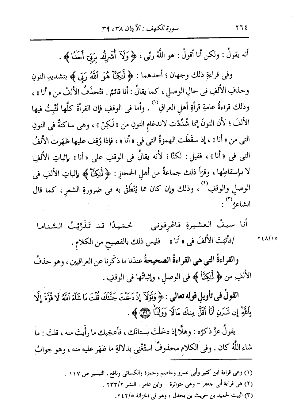 أَنَّهُ يَقُولُ: وَلَكِنْ أَنَا أَقُولُ: هُوَ اللَّهُ رَبِّي {وَلَا أُشْرِكُ بِرَبِّي أَحَدًا} [الكهف: 38] . وَفِي قِرَاءَةِ ذَلِكَ وَجْهَانِ: أَحَدُهُمَا (لَكِنَّ هُوَ اللَّهُ رَبِّي) بِتَشْدِيدِ النُّونِ وَحَذْفِ الْأَلِفِ فِي حَالِ الْوَصْلِ، كَمَا يُقَالُ: أَنَا قَائِمٌ فَتُحْذَفُ الْأَلِفُ مِنْ أَنَا، وَذَلِكَ قِرَاءَةُ عَامَّةِ قُرَّاءِ أَهْلِ الْعِرَاقِ. وَأَمَّا فِي الْوَقْفِ فَإِنَّ الْقِرَاءَةَ كُلَّهَا تُثْبِتُ فِيهَا الْأَلِفَ، لِأَنَّ النُّونَ إِنَّمَا شُدِّدَتْ لِانْدِغَامِ النُّونِ مِنْ لَكِنْ، وَهِيَ سَاكِنَةٌ فِي النُّونِ الَّتِي مِنْ أَنَا، إِذْ سَقَطَتِ الْهَمْزَةُ الَّتِي فِي أَنَا، فَإِذَا وَقَفَ عَلَيْهَا ظَهَرَتِ الْأَلِفُ الَّتِي فِي أَنَا، فَقِيلَ: لَكِنَّا، لِأَنَّهُ يُقَالُ فِي الْوَقْفِ عَلَى أَنَا بِإِثْبَاتِ الْأَلِفِ لَا بِإِسْقَاطِهَا. وَقَرَأَ ذَلِكَ جَمَاعَةٌ مِنْ أَهْلِ الْحِجَازِ: {لَكِنَّا} [الأنعام: 157] بِإِثْبَاتِ الْأَلِفِ فِي الْوَصْلِ وَالْوَقْفِ، وَذَلِكَ وَإِنْ كَانَ مِمَّا يُنْطَقُ بِهِ فِي ضَرُورَةِ الشِّعْرِ، كَمَا قَالَ الشَّاعِرُ: