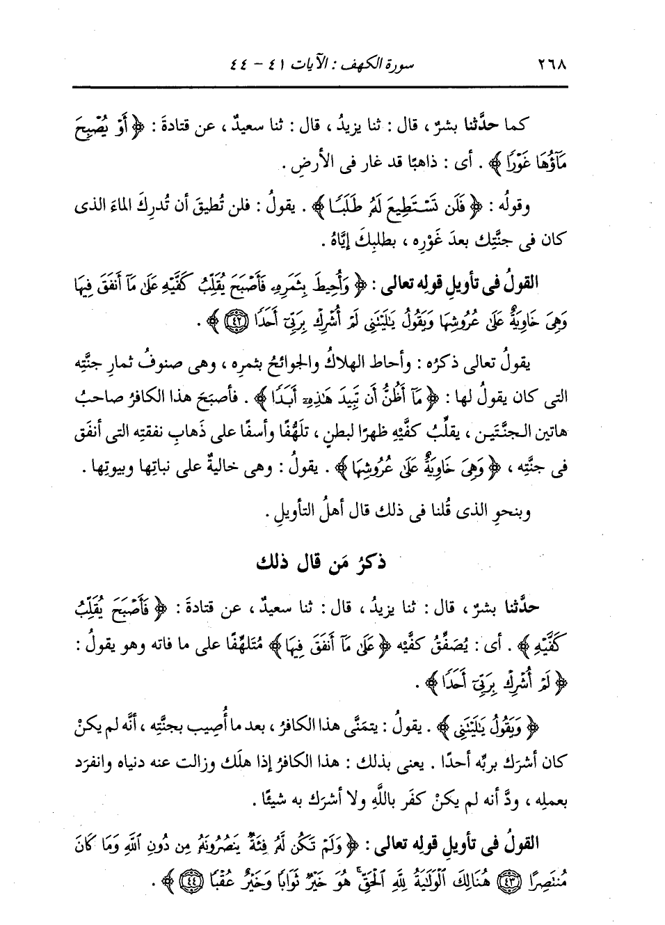 ذِكْرُ مَنْ قَالَ ذَلِكَ: حَدَّثَنَا بِشْرٌ، قَالَ: ثنا يَزِيدُ، قَالَ: ثنا سَعِيدٌ، عَنْ قَتَادَةَ، {§فَأَصْبَحَ يُقَلِّبُ كَفَّيْهِ} [الكهف: 42] أَيْ يُصَفِّقُ {كَفَّيْهِ عَلَى مَا أَنْفَقَ فِيهَا} [الكهف: 42] مُتَلَهِّفًا عَلَى مَا فَاتَهُ وَهُوَ {يَقُولُ يَا لَيْتَنِي لَمْ أَشْرِكْ بِرَبِّي أَحَدًا} [الكهف: 42] {وَيَقُولُ: يَا لَيْتَنِي} [الكهف: 42] ، يَقُولُ: يَتَمَنَّى هَذَا الْكَافِرُ بَعْدَ مَا أُصِيبَ بِجَنَّتِهِ أَنَّهُ لَمْ يَكُنْ كَانَ أَشْرَكَ بِرَبِّهِ أَحَدًا، يَعْنِي بِذَلِكَ: هَذَا الْكَافِرُ إِذَا هَلَكَ وَزَالَتْ عَنْهُ دُنْيَاهُ وَانْفَرَدَ بِعَمَلِهِ، وَدَّ أَنَّهُ لَمْ يَكُنْ كَفَرَ بِاللَّهِ وَلَا أَشْرَكَ بِهِ شَيْئًا