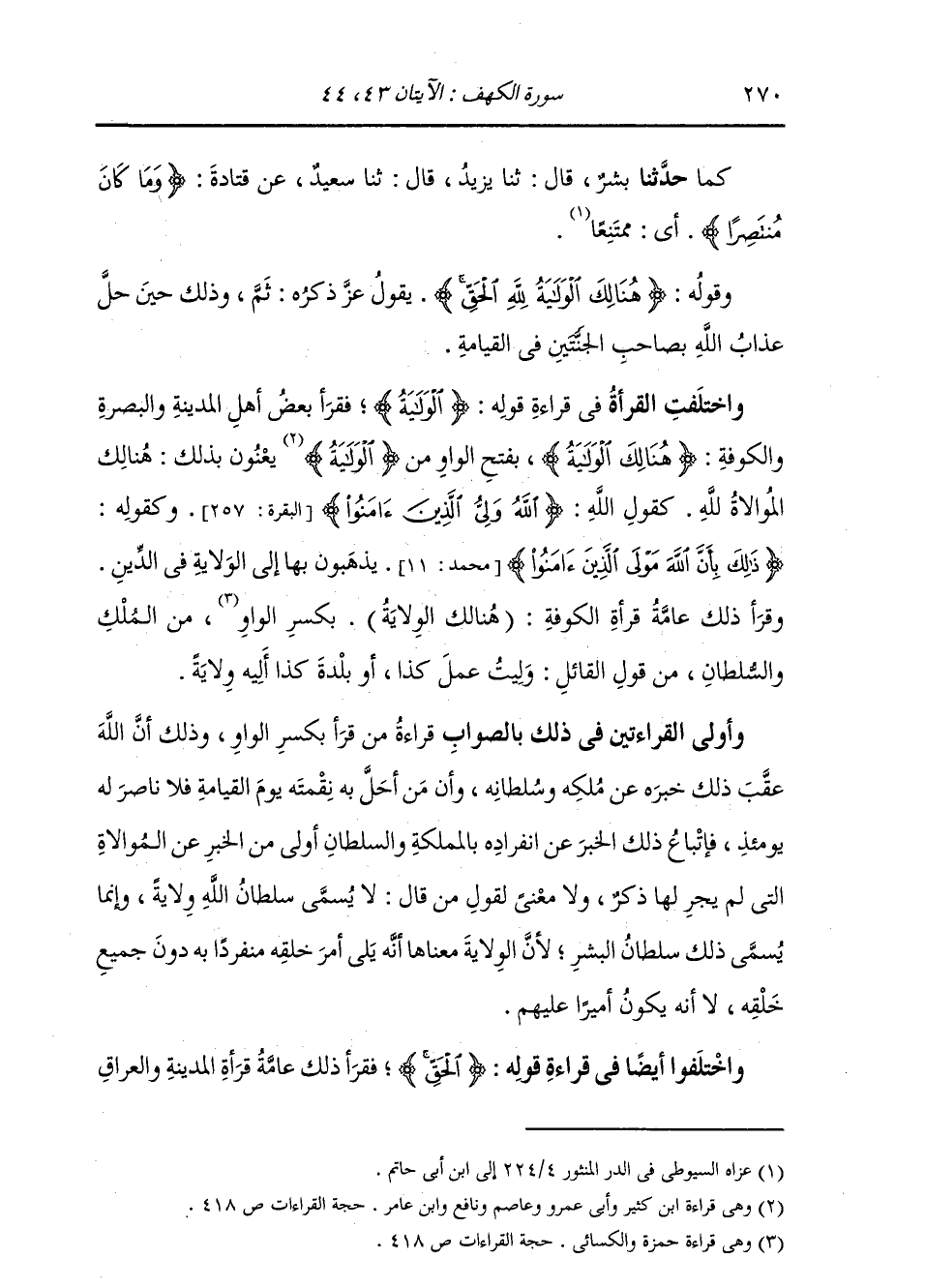 §وَقَوْلُهُ: {هُنَالِكَ الْوَلَايَةُ لِلَّهِ الْحَقِّ} [الكهف: 44] يَقُولُ عَزَّ ذِكْرُهُ: ثُمَّ وَذَلِكَ حِينَ حَلَّ عَذَابُ اللَّهِ بِصَاحِبِ الْجَنَّتَيْنِ فِي الْقِيَامَةِ. وَاخْتَلَفَتِ الْقُرَّاءُ فِي قِرَاءَةِ قَوْلِهِ: {الْوَلَايَةُ} [الكهف: 44] فَقَرَأَ بَعْضُ أَهْلِ الْمَدِينَةِ وَالْبَصْرَةِ وَالْكُوفَةِ {هُنَالِكَ الْوَلَايَةُ} [الكهف: 44] بِفَتْحِ الْوَاوِ مِنَ الْوَلَايَةِ، يَعْنُونَ بِذَلِكَ هُنَالِكَ الْمُوَالَاةُ لِلَّهِ، كَقَوْلِ اللَّهِ: {اللَّهُ وَلِيُّ الَّذِينَ آمَنُوا} [البقرة: 257] وَكَقَوْلِهِ: {ذَلِكَ بِأَنَّ اللَّهَ مَوْلَى الَّذِينَ آمَنُوا} [محمد: 11] يَذْهَبُونَ بِهَا إِلَى الْوَلَايَةِ فِي الدِّينِ. وَقَرَأَ ذَلِكَ عَامَّةُ قُرَّاءِ الْكُوفَةِ: (هُنَالِكَ الْوِلَايَةُ) بِكَسْرِ الْوَاوِ: مِنَ الْمُلْكِ وَالسُّلْطَانِ، مِنْ قَوْلِ الْقَائِلِ: وَلِيتُ عَمَلَ كَذَا، أَوْ بَلْدَةَ كَذَا أَلِيهِ وِلَايَةً. وَأَوْلَى الْقِرَاءَتَيْنِ فِي ذَلِكَ بِالصَّوَابِ، قِرَاءَةُ مَنْ قَرَأَ بِكَسْرِ الْوَاوِ، وَذَلِكَ أَنَّ اللَّهَ عَقَّبَ ذَلِكَ خَبَرَهُ عَنْ مُلْكِهِ وَسُلْطَانِهِ، وَأَنَّ مَنْ أَحَلِّ بِهِ نِقْمَتَهُ يَوْمَ الْقِيَامَةِ فَلَا نَاصِرَ لَهُ يَوْمَئِذٍ، فَاتِّبَاعُ ذَلِكَ الْخَبَرِ عَنِ انْفِرَادِهِ بِالْمَمْلَكَةِ وَالسُّلْطَانِ أَوْلَى مِنَ الْخَبَرِ عَنِ الْمُوَالَاةِ الَّتِي لَمْ يَجْرِ لَهَا ذِكْرٌ وَلَا مَعْنًى، لِقَوْلِ مَنْ قَالَ: لَا يُسَمَّى سُلْطَانُ اللَّهِ وِلَايَةً، وَإِنَّمَا يُسَمَّى ذَلِكَ سُلْطَانُ الْبَشَرِ، لِأَنَّ الْوَلَايَةَ مَعْنَاهَا أَنَّهُ يَلِي أَمْرَ خَلْقِهِ مُنْفَرِدًا بِهِ دُونَ جَمِيعِ خَلْقِهِ، لَا أَنَّهُ يَكُونُ أَمِيرًا عَلَيْهِمْ. وَاخْتَلَفُوا أَيْضًا فِي قِرَاءَةِ قَوْلِهِ {الْحَقِّ} [البقرة: 26] فَقَرَأَ ذَلِكَ عَامَّةُ قُرَّاءِ الْمَدِينَةِ وَالْعِرَاقِ