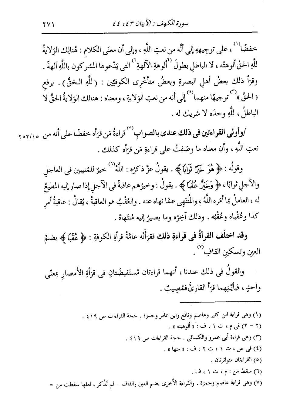 خَفْضًا، عَلَى تَوْجِيهِهِ إِلَى أَنَّهُ مِنْ نَعْتِ اللَّهِ، وَإِلَى أَنَّ مَعْنَى الْكَلَامِ: هُنَالِكَ الْوَلَايَةُ لِلَّهِ الْحَقِّ أُلُوهِيَّتُهُ، لَا الْبَاطِلُ بِطُولَ أُلُوهِيَّتِهِ الَّتِي يَدْعُونَهَا الْمُشْرِكُونَ بِاللَّهِ آلِهَةً. وَقَرَأَ ذَلِكَ بَعْضُ أَهْلِ الْبَصْرَةِ وَبَعْضُ مُتَأَخِّرِي الْكُوفِيِّينَ: (لِلَّهِ الْحَقُّ) بِرَفْعِ الْحَقِّ تَوْجِيهًا مِنْهُمَا إِلَى أَنَّهُ مِنْ نَعْتِ الْوَلَايَةِ، وَمَعْنَاهُ: هُنَالِكَ الْوَلَايَةُ الْحَقُّ، لَا الْبَاطِلُ لِلَّهِ وَحْدَهُ لَا شَرِيكَ لَهُ. وَأَوْلَى الْقِرَاءَتَيْنِ عِنْدِي فِي ذَلِكَ بِالصَّوَابِ، قِرَاءَةُ مَنْ قَرَأَهُ خَفْضًا عَلَى أَنَّهُ مِنْ نَعْتِ اللَّهِ، وَأَنَّ مَعْنَاهُ مَا وَصَفْتُ عَلَى قِرَاءَةِ مَنْ قَرَأَهُ كَذَلِكَ