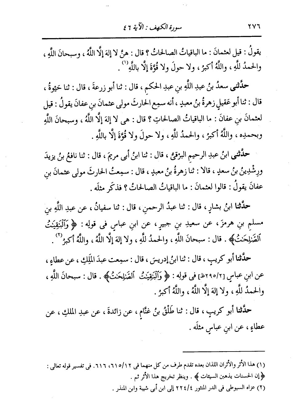 حَدَّثَنَا ابْنُ بَشَّارٍ، قَالَ: ثنا عَبْدُ الرَّحْمَنِ، قَالَ: ثنا سُفْيَانُ، عَنْ عَبْدِ اللَّهِ بْنِ مُسْلِمِ بْنِ هُرْمُزٍ، عَنْ سَعِيدِ بْنِ جُبَيْرٍ، عَنِ ابْنِ عَبَّاسٍ، فِي قَوْلِهِ: {§وَالْبَاقِيَاتُ الصَّالِحَاتُ} [الكهف: 46] قَالَ: سُبْحَانَ اللَّهِ، وَالْحَمْدُ لِلَّهِ، وَلَا إِلَهَ إِلَّا اللَّهُ، وَاللَّهُ أَكْبَرُ