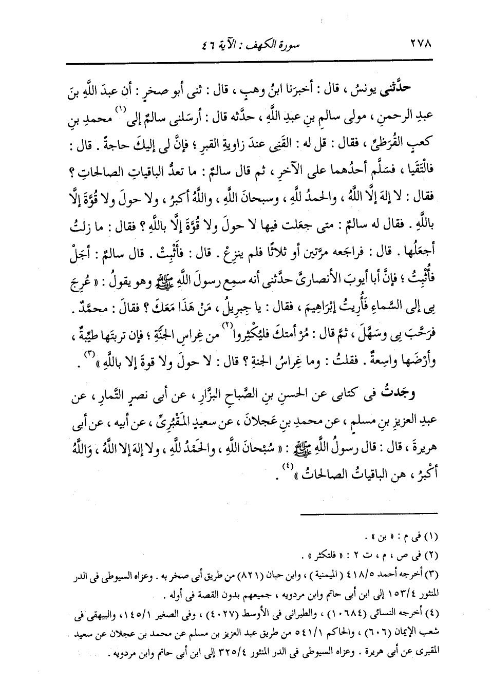حَدَّثَنِي يُونُسُ، قَالَ: أَخْبَرَنَا ابْنُ وَهْبٍ، قَالَ: ثني أَبُو صَخْرٍ: أَنَّ عَبْدَ اللَّهِ بْنَ عَبْدِ الرَّحْمَنِ، مَوْلَى سَالِمِ بْنِ عَبْدِ اللَّهِ، حَدَّثَهُ قَالَ: أَرْسَلَنِي سَالِمُ بْنُ مُحَمَّدِ بْنِ كَعْبٍ الْقُرَظِيُّ، فَقَالَ: قُلْ لَهُ: الْقَنِي عِنْدَ زَاوِيَةِ الْقَبْرِ، فَإِنَّ لِي إِلَيْكَ حَاجَةً، قَالَ: فَالْتَقَيَا، فَسَلَّمَ أَحَدُهُمَا عَلَى الْآخَرِ، ثُمَّ قَالَ سَالِمٌ: مَا تَعُدُّ {الْبَاقِيَاتُ الصَّالِحَاتُ} [الكهف: 46] ؟ فَقَالَ: لَا إِلَهَ إِلَّا اللَّهُ، وَالْحَمْدُ لِلَّهِ، وَسُبْحَانَ اللَّهِ، وَاللَّهُ أَكْبَرُ، وَلَا حَوْلَ وَلَا قُوَّةَ إِلَّا بِاللَّهِ، فَقَالَ لَهُ سَالِمٌ: مَتَى جَعَلْتَ فِيهَا لَا حَوْلَ وَلَا قُوَّةَ إِلَّا بِاللَّهِ؟ فَقَالَ: مَا زِلْتُ أَجْعَلُهَا، قَالَ: فَرَاجَعَهُ مَرَّتَيْنِ أَوْ ثَلَاثًا فَلَمْ يَنْزِعْ. قَالَ: فَأَثْبَتَ، قَالَ سَالِمٌ: أَجَلْ، فَاثْبَتْ فَإِنَّ أَبَا أَيُّوبَ الْأَنْصَارِيَّ حَدَّثَنِي أَنَّهُ سَمِعَ رَسُولَ اللَّهِ صَلَّى اللهُ عَلَيْهِ وَسَلَّمَ وَهُوَ يَقُولُ: " §عُرِجَ بِي إِلَى السَّمَاءِ فَأُرِيتُ إِبْرَاهِيمَ، فَقَالَ: يَا جِبْرِيلُ مَنْ هَذَا مَعَكَ؟ فَقَالَ: مُحَمَّدٌ فَرَحَّبَ بِي وَسَهَّلَ، ثُمَّ قَالَ: مُرْ أُمَّتَكَ فَلْتُكْثِرْ مِنْ غِرَاسِ الْجَنَّةِ، فَإِنَّ تُرْبَتَهَا طَيِّبَةٌ وَأَرْضَهَا وَاسِعَةٌ، فَقُلْتُ: وَمَا غِرَاسُ الْجَنَّةِ؟ قَالَ: لَا حَوْلَ وَلَا قُوَّةَ إِلَّا بِاللَّهِ "