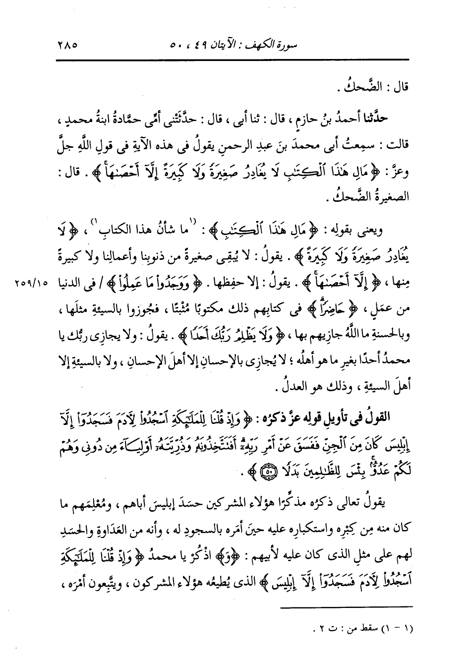 حَدَّثَنَا أَحْمَدُ بْنُ حَازِمٍ، قَالَ: ثنا أَبِي، قَالَ: حَدَّثَتْنِي أُمِّي حَمَّادَةُ ابْنَةُ مُحَمَّدٍ، قَالَ: سَمِعْتُ أَبِي مُحَمَّدِ بْنَ عَبْدِ الرَّحْمَنِ، يَقُولُ فِي هَذِهِ الْآيَةِ فِي قَوْلِ اللَّهِ عَزَّ وَجَلَّ: {§مَالِ هَذَا الْكِتَابِ لَا يُغَادِرُ صَغِيرَةً وَلَا كَبِيرَةً إِلَّا أَحْصَاهَا} [الكهف: 49] قَالَ: الصَّغِيرَةُ: الضَّحِكُ وَيَعْنِي بِقَوْلِهِ: {مَالِ هَذَا الْكِتَابِ} [الكهف: 49] مَا شَأْنُ هَذَا الْكِتَابِ {لَا يُغَادِرُ صَغِيرَةً وَلَا كَبِيرَةً} [الكهف: 49] يَقُولُ: لَا يَبْقَى صَغِيرَةً مِنْ ذُنُوبِنَا وَأَعْمَالِنَا وَلَا كَبِيرَةً مِنْهَا {إِلَّا أَحْصَاهَا} [الكهف: 49] يَقُولُ: إِلَّا حَفِظَهَا. {وَوَجَدُوا مَا عَمِلُوا} [الكهف: 49] فِي الدُّنْيَا مِنْ عَمَلٍ {حَاضِرًا} [الكهف: 49] فِي كِتَابِهِمْ ذَلِكَ مَكْتُوبًا مُثْبَتًا، فَجُوزُوا بِالسَّيِّئَةِ مِثْلَهَا، وَالْحَسَنَةِ مَا اللَّهُ جَازِيهِمْ بِهَا {وَلَا يَظْلِمُ رَبُّكَ أَحَدًا} [الكهف: 49] يَقُولُ: وَلَا يُجَازِي رَبُّكَ أَحَدًا يَا مُحَمَّدُ بِغَيْرِ مَا هُوَ أَهْلُهُ، لَا يُجَازِي بِالْإِحْسَانِ إِلَّا أَهْلُ الْإِحْسَانِ، وَلَا بِالسَّيِّئَةِ إِلَّا أَهْلُ السَّيِّئَةِ، وَذَلِكَ هُوَ الْعَدْلُ