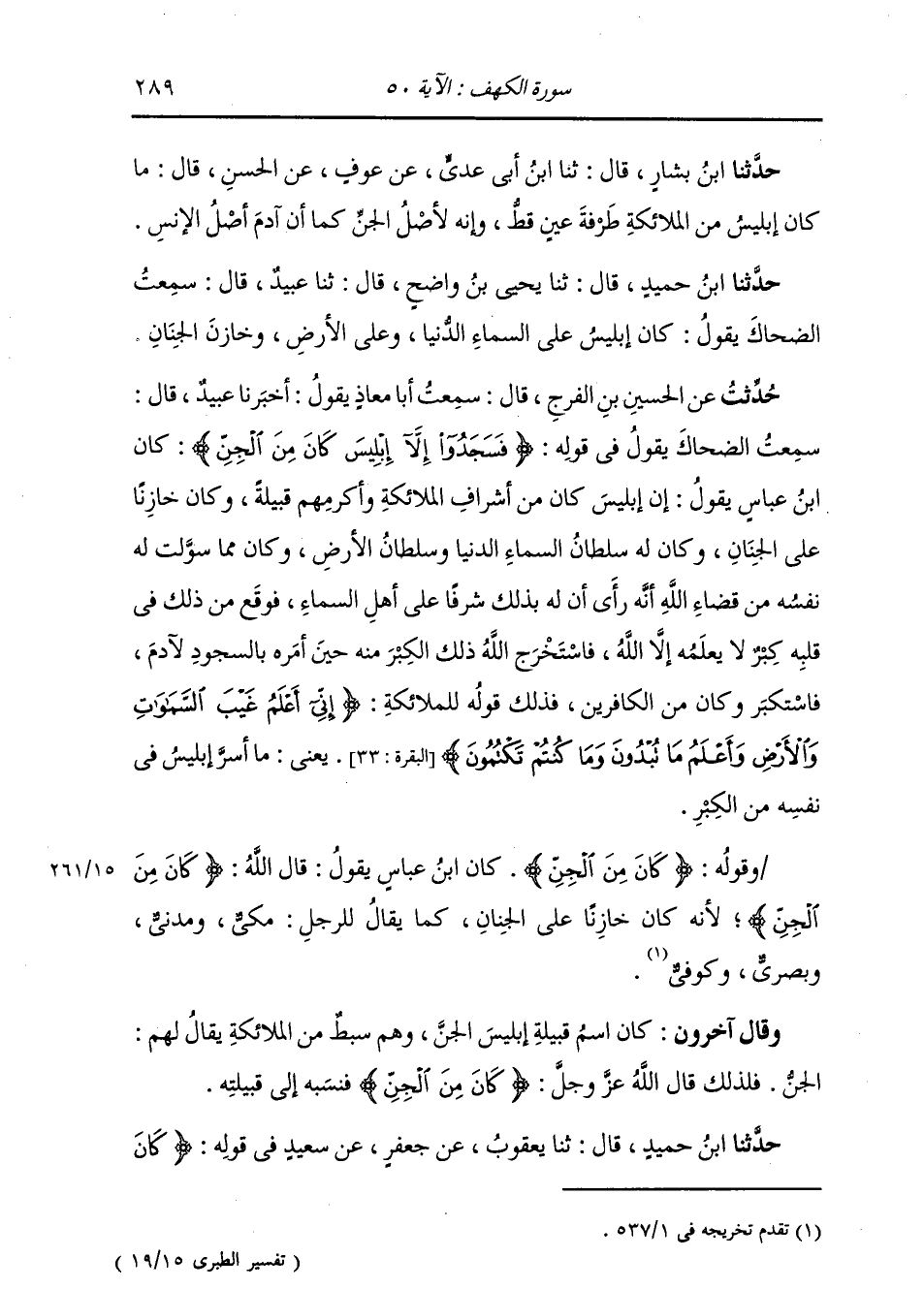§وَقَوْلُهُ: {كَانَ مِنَ الْجِنِّ} [الكهف: 50] كَانَ ابْنُ عَبَّاسٍ يَقُولُ: قَالَ اللَّهُ {كَانَ مِنَ الْجِنِّ} [الكهف: 50] لِأَنَّهُ كَانَ خَازِنًا عَلَى الْجِنَانِ، كَمَا يُقَالُ لِلرَّجُلِ: مَكِّيُّ، وَمَدَنِيُّ، وَبَصْرِيُّ، وَكُوفِيُّ. وَقَالَ آخَرُونَ: كَانَ اسْمُ قَبِيلَةِ إِبْلِيسَ الْجِنَّ، وَهُمْ سِبْطٌ مِنَ الْمَلَائِكَةِ يُقَالُ لَهُمُ الْجِنُّ، فَلِذَلِكَ قَالَ اللَّهُ عَزَّ وَجَلَّ {كَانَ مِنَ الْجِنِّ} [الكهف: 50] فَنَسَبَهُ إِلَى قَبِيلَتِهِ