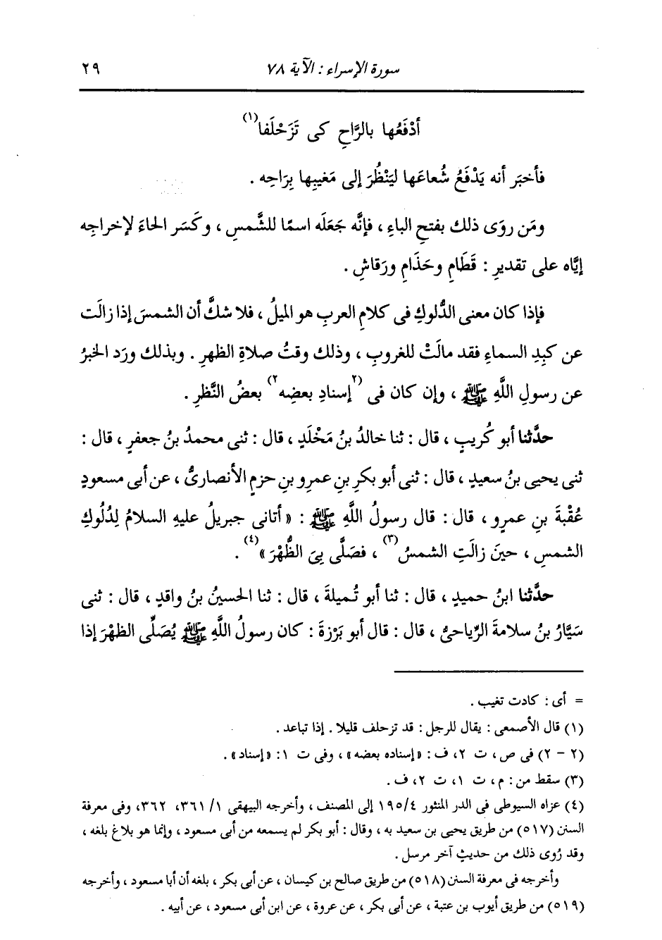 فَأَخْبَرَ أَنَّهُ يَدْفَعُ شُعَاعَهَا لِيَنْظُرَ إِلَى مَغِيبِهَا بِرَاحَةٍ. وَمَنْ رَوَى ذَلِكَ بِفَتْحِ الْبَاءِ، فَإِنَّهُ جَعَلَهُ اسْمًا لِلشَّمْسِ وَكَسَرَ الْحَاءَ لِإِخْرَاجِهِ إِيَّاهُ عَلَى تَقْدِيرِ قَطَامِ وَحَذَامِ وَرَقَاشِ، فَإِذَا كَانَ مَعْنَى الدُّلُوكِ فِي كَلَامِ الْعَرَبِ هُوَ الْمَيْلُ، فَلَا شَكَّ أَنَّ الشَّمْسَ إِذَا زَالَتْ عَنْ كَبِدِ السَّمَاءِ، فَقَدْ مَالَتْ لِلْغُرُوبٍ، وَذَلِكَ وَقْتُ صَلَاةِ الظُّهْرِ، وَبِذَلِكَ وَرَدَ الْخَبَرُ عَنْ رَسُولِ اللَّهِ صَلَّى اللهُ عَلَيْهِ وَسَلَّمَ، وَإِنْ كَانَ فِي إِسْنَادِ بَعْضِهِ بَعْضُ النَّظَرِ
