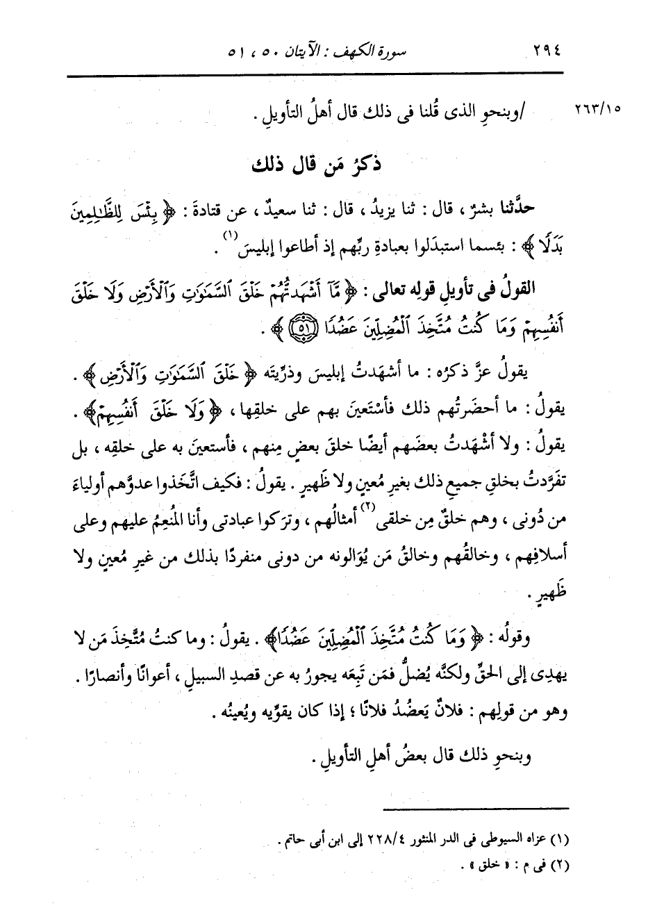 §الْقَوْلُ فِي تَأْوِيلِ قَوْلِهِ تَعَالَى: {مَا أَشْهَدْتُهُمْ خَلْقَ السَّمَوَاتِ وَالْأَرْضِ وَلَا خَلْقَ أَنْفُسِهِمْ وَمَا كُنْتُ مُتَّخِذَ الْمُضِلِّينَ عَضُدًا} يَقُولُ عَزَّ ذِكْرُهُ: مَا أَشْهَدْتُ إِبْلِيسَ وَذُرِّيَّتَهُ {خَلْقَ السَّمَوَاتِ وَالْأَرْضِ} يَقُولُ: مَا أَحْضَرْتُهُمْ ذَلِكَ فَأَسْتَعِينُ بِهِمْ عَلَى خَلْقِهَا {وَلَا خَلْقَ أَنْفُسِهِمْ} [الكهف: 51] يَقُولُ: وَلَا أَشْهَدْتُ بَعْضَهُمْ أَيْضًا خَلْقَ بَعْضٍ مِنْهُمْ، فَأَسْتَعِينُ بِهِ عَلَى خَلْقِهِ، بَلْ تَفَرَّدْتُ بِخَلْقِ جَمِيعِ ذَلِكَ بِغَيْرِ مُعِينٍ وَلَا ظَهِيرٍ، يَقُولُ: فَكَيْفَ اتَّخَذُوا عَدُوَّهُمْ أَوْلِيَاءَ مِنْ دُونِي، وَهُمْ خَلْقٌ مِنْ خَلْقٍ أَمْثَالِهِمْ، وَتَرَكُوا عِبَادَتِي وَأَنَا الْمُنْعِمُ عَلَيْهِمْ وَعَلَى أَسْلَافِهِمْ، وَخَالِقِهِمْ وَخَالِقِ مَنْ يُوَالُونَهُ مِنْ دُونِي مُنْفَرِدًا بِذَلِكَ مِنْ غَيْرِ مُعِينٍ وَلَا ظَهِيرٍ