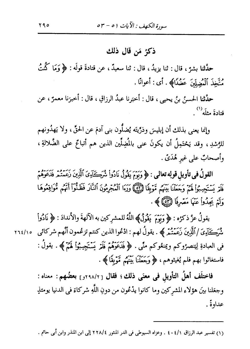ذِكْرُ مَنْ قَالَ ذَلِكَ: حَدَّثَنَا بِشْرٌ، قَالَ: ثنا يَزِيدُ، قَالَ: ثنا سَعِيدٌ، عَنْ قَتَادَةَ، قَوْلُهُ: {§وَمَا كُنْتُ مُتَّخِذَ الْمُضِلِّينَ عَضُدًا} [الكهف: 51] أَيْ أَعْوَانًا حَدَّثَنَا الْحَسَنُ بْنُ يَحْيَى، قَالَ: أَخْبَرَنَا عَبْدُ الرَّزَّاقِ، قَالَ: أَخْبَرَنَا مَعْمَرٌ، عَنْ قَتَادَةَ مِثْلَهُ وَإِنَّمَا يَعْنِي بِذَلِكَ أَنَّ إِبْلِيسَ وَذُرِّيَّتَهُ يُضِلُّونَ بَنِي آدَمَ عَنِ الْحَقِّ، وَلَا يُهْدُونَهُمْ لِلرُّشْدِ، وَقَدْ يَحْتَمِلُ أَنْ يَكُونَ عَنَى بِالْمُضِلِّينَ الَّذِينَ هُمْ أَتْبَاعٌ عَلَى الضَّلَالَةِ، وَأَصْحَابٌ عَلَى غَيْرِ هُدًى