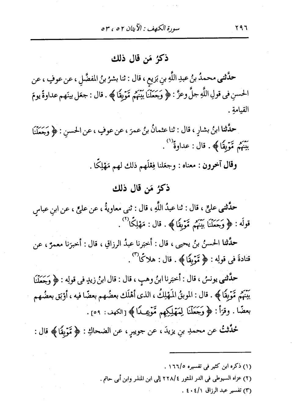 حُدِّثْتُ عَنْ مُحَمَّدِ بْنِ يَزِيدَ، عَنْ جُوَيْبِرٍ، عَنِ الضَّحَّاكِ، {§مَوْبِقًا} [الكهف: 52] قَالَ: -[297]- هَلَاكًا