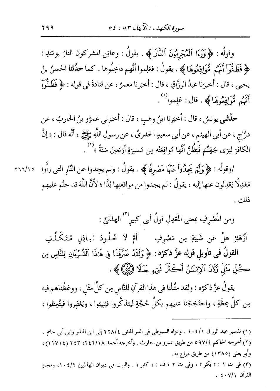 §وَقَوْلُهُ: {وَلَمْ يَجِدُوا عَنْهَا مَصْرِفًا} [الكهف: 53] يَقُولُ: وَلَمْ يَجِدُوا عَنِ النَّارِ الَّتِي رَأَوْا مَعْدِلًا يَعْدِلُونَ عَنْهَا إِلَيْهِ. يَقُولُ: لَمْ يَجِدُوا مِنْ مُوَاقَعَتِهَا بُدًّا، لِأَنَّ اللَّهَ قَدْ حَتَّمَ عَلَيْهِمْ ذَلِكَ. وَمِنَ الْمَصْرِفِ بِمَعْنَى الْمَعْدِلِ قَوْلُ أَبِي كَبِيرٍ الْهُذَلِيِّ:
