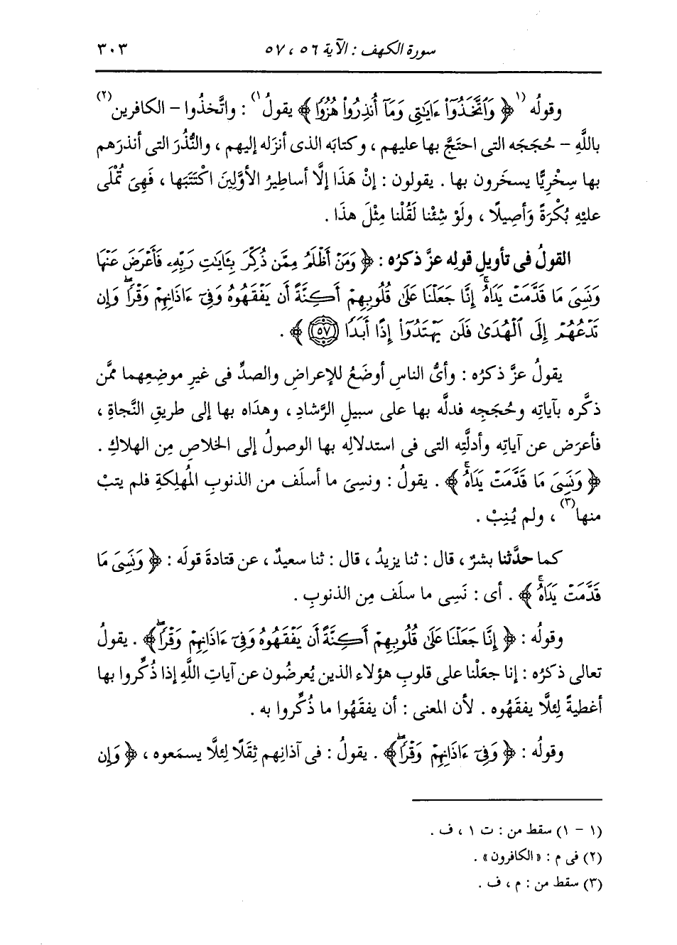 §وَقَوْلُهُ: {إِنَّا جَعَلْنَا عَلَى قُلُوبِهِمْ أَكِنَّةً أَنْ يَفْقَهُوهُ وَفِي آذَانِهِمْ وَقْرًا} [الكهف: 57] يَقُولُ تَعَالَى ذِكْرُهُ: إِنَّا جَعَلْنَا عَلَى قُلُوبِ هَؤُلَاءِ الَّذِينَ يُعْرِضُونَ عَنْ آيَاتِ اللَّهِ إِذَا ذُكِّرُوا بِهَا أَغْطِيَةً لِئَلَّا يَفْقَهُوهُ، لِأَنَّ الْمَعْنَى أَنْ يَفْقَهُوا مَا ذُكِّرُوا بِهِ