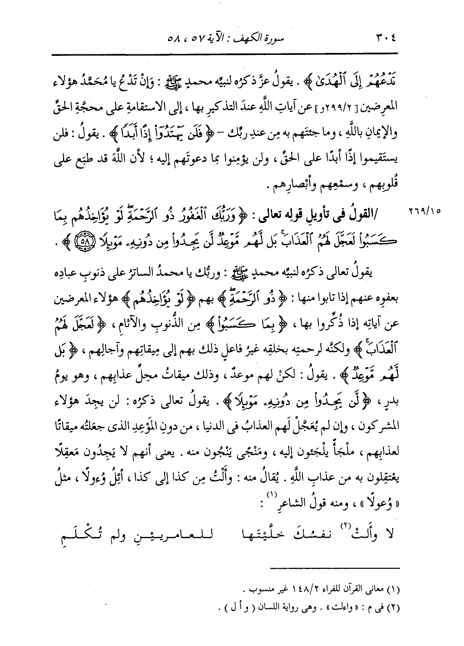 §الْقَوْلُ فِي تَأْوِيلِ قَوْلِهِ تَعَالَى: {وَرَبُّكَ الْغَفُورُ ذُو الرَّحْمَةِ لَوْ يُؤَاخِذُهُمْ بِمَا كَسَبُوا لَعَجَّلَ لَهُمُ الْعَذَابَ بَلْ لَهُمْ مَوْعِدٌ لَنْ يَجِدُوا مِنْ دُونِهِ مَوْئِلًا} [الكهف: 58] يَقُولُ تَعَالَى ذِكْرُهُ لِنَبِيِّهِ مُحَمَّدٍ صَلَّى اللهُ عَلَيْهِ وَسَلَّمَ: وَرَبُّكُ السَّاتِرُ يَا مُحَمَّدُ عَلَى ذُنُوبِ عِبَادِهِ بِعَفْوِهِ عَنْهُمْ إِذَا تَابُوا مِنْهُمْ {ذُو الرَّحْمَةِ} [الأنعام: 133] بِهِمْ {لَوْ يُؤَاخِذُهُمْ بِمَا كَسَبُوا} [الكهف: 58] هَؤُلَاءِ الْمُعْرِضِينَ عَنْ آيَاتِهِ إِذَا ذُكِّرُوا بِهَا بِمَا كَسَبُوا مِنَ الذُّنُوبِ وَالْآثَامِ {لَعَجَّلَ لَهُمُ الْعَذَابَ} [الكهف: 58] وَلَكِنَّهُ لِرَحْمَتِهِ بِخَلْقِهِ غَيْرُ فَاعِلٍ ذَلِكَ بِهِمْ إِلَى مِيقَاتِهِمْ وَآجَالِهِمْ {بَلْ لَهُمْ مَوْعِدٌ} [الكهف: 58] يَقُولُ: لَكِنْ لَهُمْ مَوْعِدٌ، وَذَلِكَ مِيقَاتُ مَحَلِّ عَذَابِهِمْ، وَهُوَ يَوْمُ بَدْرٍ {لَنْ يَجِدُوا مِنْ دُونِهِ مَؤْئِلًا} . يَقُولُ تَعَالَى ذِكْرُهُ: لَنْ يَجِدَ هَؤُلَاءِ الْمُشْرِكُونِ، وَإِنْ لَمْ يُعَجَّلْ لَهُمُ الْعَذَابُ فِي الدُّنْيَا مِنْ دُونِ الْمَوْعِدِ الَّذِي جَعَلْتُهُ مِيقَاتًا لِعَذَابِهِمْ، مِمَّا يَلْجَئُونَ إِلَيْهِ، وَمَنْجًى يَنْجُونَ مَعَهُ، يَعْنِي أَنَّهُمْ لَا يَجِدُونَ مَعْقِلًا يِعْتَقِلُونَ بِهِ مِنْ عَذَابِ اللَّهِ، يُقَالُ مِنْهُ: وَأَلْتُ مِنْ كَذَا إِلَى كَذَا، أَئِلُ وُءُولًا، مِثْلُ وُعُولًا، وَمِنْهُ قَوْلُ الشَّاعِرِ: