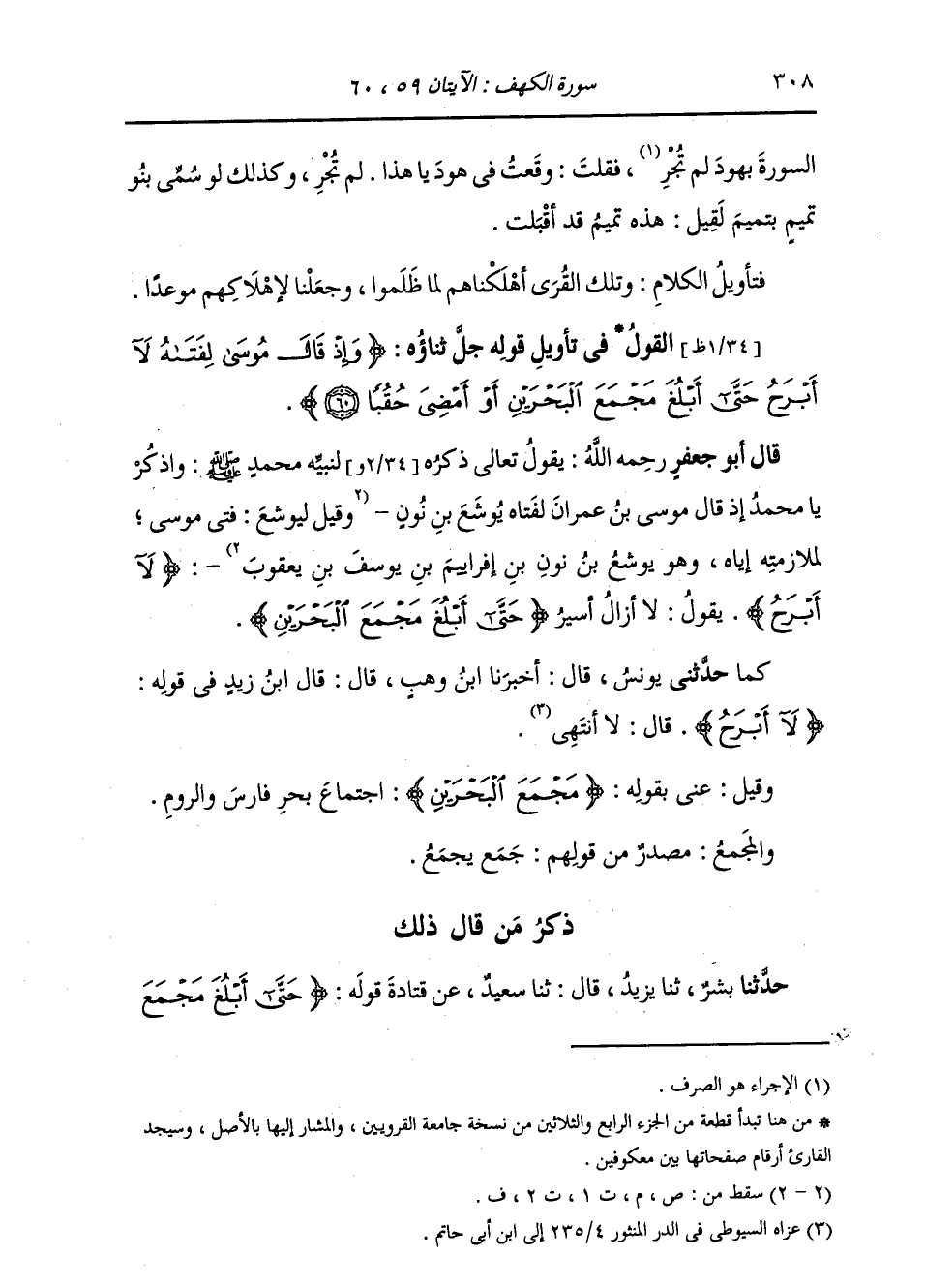 ذِكْرُ مَنْ قَالَ ذَلِكَ: حَدَّثَنَا بِشْرٌ، قَالَ: ثنا يَزِيدُ، قَالَ: ثنا سَعِيدٌ، عَنْ قَتَادَةَ، قَوْلُهُ: {§حَتَّى أَبْلُغَ مَجْمَعِ -[309]- الْبَحْرَيْنِ} [الكهف: 60] وَالْبَحْرَانِ: بَحْرُ فَارِسَ وَبَحْرُ الرُّومِ، وَبَحْرُ الرُّومِ مِمَّا يَلِي الْمَغْرِبَ، وَبَحْرُ فَارِسَ مِمَّا يَلِي الْمَشْرِقَ