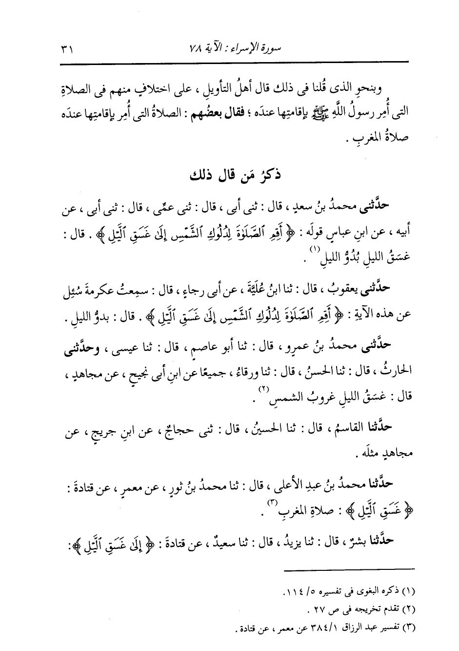 حَدَّثَنَا بِشْرٌ، قَالَ: ثنا يَزِيدُ، قَالَ: ثنا سَعِيدٌ، عَنْ قَتَادَةَ {§إِلَى غَسَقِ اللَّيْلِ} [الإسراء: 78]-[32]- بُدُوُّ اللَّيْلِ لِصَلَاةِ الْمَغْرِبِ وَقَدْ ذَكَرَ لَنَا أَنَّ نَبِيَّ اللَّهِ صَلَّى اللهُ عَلَيْهِ وَسَلَّمَ كَانَ يَقُولُ: «لَا تَزَالُ طَائِفَةٌ مِنْ أُمَّتِي عَلَى الْفِطْرَةِ مَا صَلَّوْا صَلَاةَ الْمَغْرِبِ قَبْلَ أَنْ تَبْدُوَ النُّجُومُ»