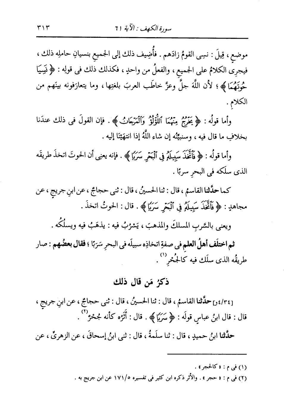 حَدَّثَنَا الْقَاسِمُ، قَالَ: ثنا الْحُسَيْنُ، قَالَ: ثني حَجَّاجٌ، عَنِ ابْنِ جُرَيْجٍ، عَنْ مُجَاهِدٍ، {§فَاتَّخَذَ سَبِيلَهُ فِي الْبَحْرِ سَرَبًا} [الكهف: 61] قَالَ: الْحُوتُ اتَّخَذَ، وَيَعْنِي بِالسَّرَبِ: الْمَسْلَكُ وَالْمَذْهَبُ، يَسْرُبُ فِيهِ: يَذْهَبُ فِيهِ وَيَسْلُكُهُ ثُمَّ اخْتَلَفَ أَهْلُ الْعِلْمِ فِي صِفَةِ اتِّخَاذِهِ سَبِيلَهُ فِي الْبَحْرِ سَرَبًا، فَقَالَ بَعْضُهُمْ: صَارَ طَرِيقُهُ الَّذِي يَسْلُكُ فِيهِ كَالْحَجَرِ