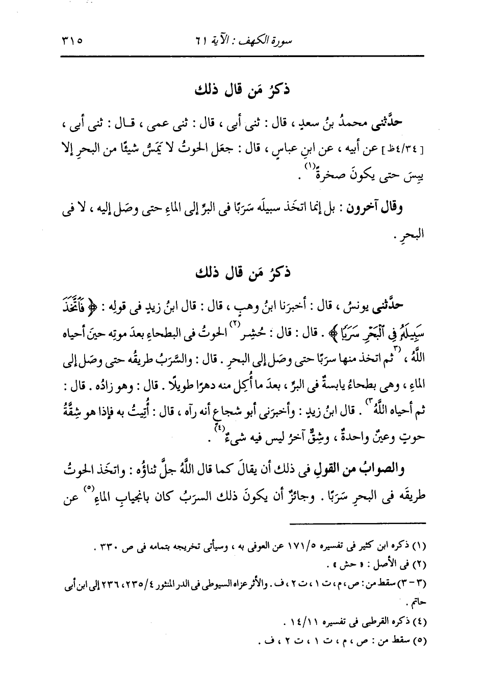 ذِكْرُ مَنْ قَالَ ذَلِكَ: حَدَّثَنِي يُونُسُ، قَالَ: أَخْبَرَنَا ابْنُ وَهْبٍ، قَالَ: قَالَ ابْنُ زَيْدٍ، فِي قَوْلِهِ: {§فَاتَّخَذَ سَبِيلَهُ فِي الْبَحْرِ سَرَبًا} [الكهف: 61] قَالَ: قَالَ: حُشِرَ الْحُوتُ فِي الْبَطْحَاءِ بَعْدَ مَوْتِهِ حِينَ أَحْيَاهُ اللَّهُ