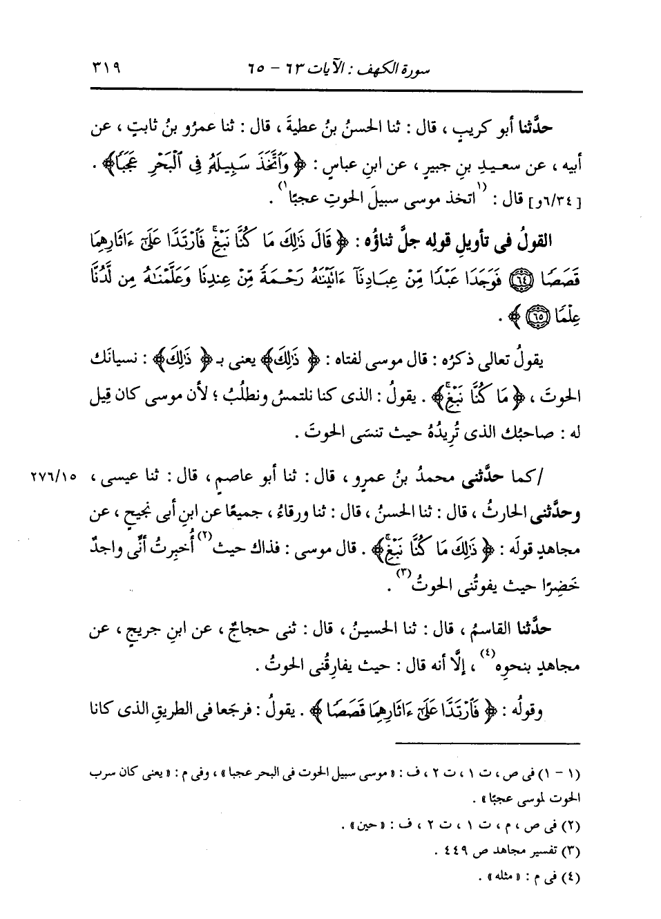 حَدَّثَنِي مُحَمَّدُ بْنُ عَمْرٍو، قَالَ: ثنا أَبُو عَاصِمٍ، قَالَ: ثنا عِيسَى، وَحَدَّثَنِي الْحَارِثُ، قَالَ: ثنا الْحَسَنُ، قَالَ: ثنا وَرْقَاءُ، جَمِيعًا عَنِ ابْنِ أَبِي نَجِيحٍ، عَنْ مُجَاهِدٍ، قَوْلُهُ: {§ذَلِكَ مَا كُنَّا نَبْغِ} [سورة: الكهف، آية رقم: 64] قَالَ مُوسَى: فَذَلِكَ حِينَ أُخْبِرْتُ أَنِّي وَاجِدٌ خَضِرًا حَيْثُ يَفُوتَنِي الْحُوتُ
