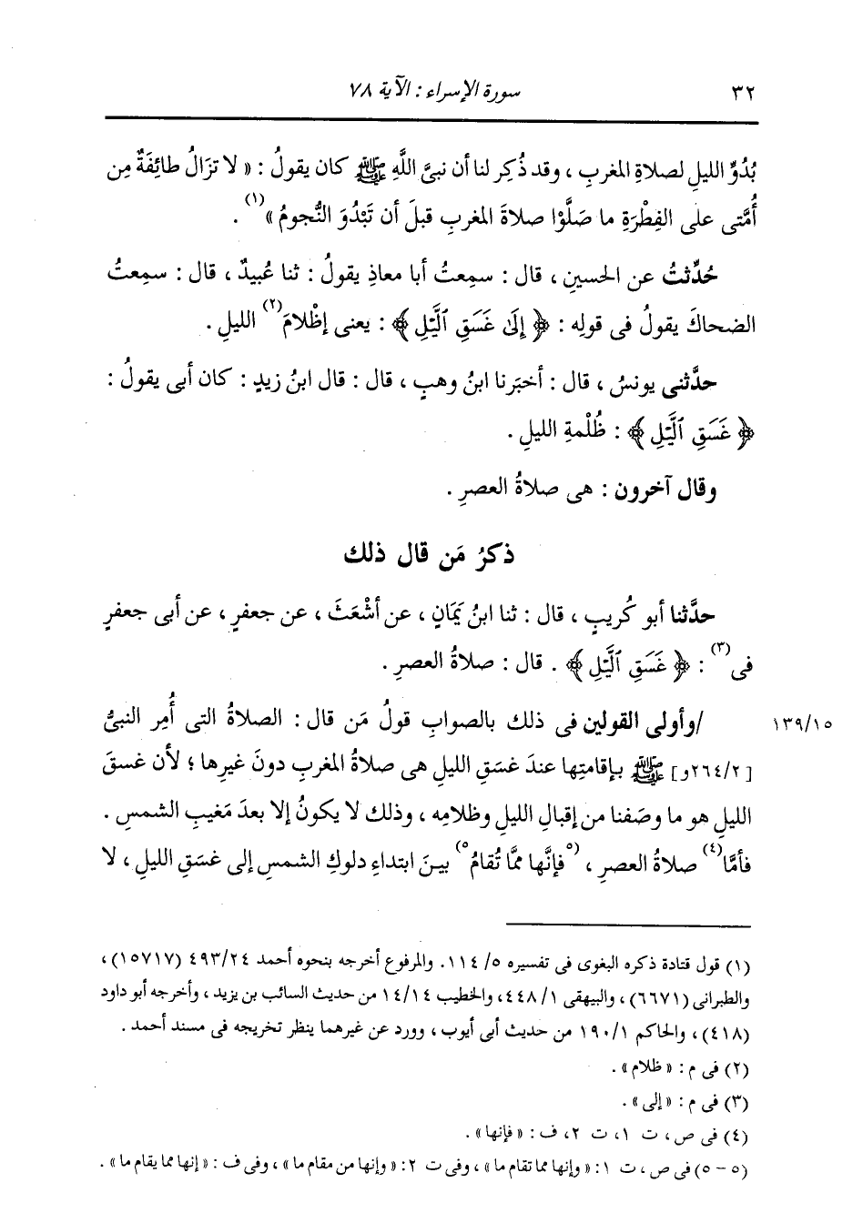 ذِكْرُ مَنْ قَالَ ذَلِكَ: حَدَّثَنَا أَبُو كُرَيْبٍ، قَالَ: ثنا ابْنُ يَمَانٍ، عَنْ أَشْعَثَ، عَنْ جَعْفَرٍ، عَنْ أَبِي جَعْفَرٍ، {§إِلَى غَسَقِ اللَّيْلِ} [الإسراء: 78] قَالَ: صَلَاةُ الْعَصْرِ وَأَوْلَى الْقَوْلَيْنِ فِي ذَلِكَ بِالصَّوَابِ، قَوْلُ مَنْ قَالَ: الصَّلَاةُ الَّتِي أَمَرَ النَّبِيُّ صَلَّى اللهُ عَلَيْهِ وَسَلَّمَ بِإِقَامَتِهَا عِنْدَ غَسَقِ اللَّيْلِ هِيَ صَلَاةُ الْمَغْرِبِ دُونَ غَيْرِهَا، لِأَنَّ غَسَقَ اللَّيْلِ هُوَ مَا وَصَفْنَا مِنْ إِقْبَالِ اللَّيْلِ وَظَلَامِهِ، وَذَلِكَ لَا يَكُونُ إِلَّا بَعْدَ مَغِيبِ الشَّمْسِ. فَأَمَّا صَلَاةُ الْعَصْرِ، فَإِنَّهَا مِمَّا تُقَامُ بَيْنَ ابْتِدَاءِ دُلُوِكِ الشَّمْسِ إِلَى غَسَقِ اللَّيْلِ، لَا -[33]- عِنْدَ غَسَقِ اللَّيْلِ