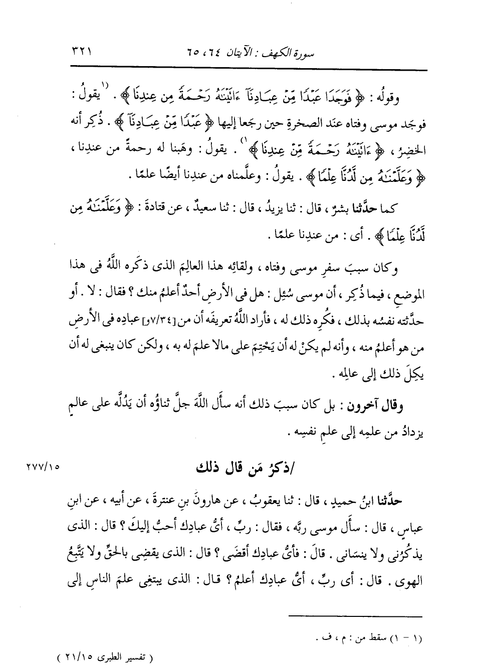 حَدَّثَنَا بِشْرٌ، قَالَ: ثنا يَزِيدُ، قَالَ: ثنا سَعِيدٌ، عَنْ قَتَادَةَ، {§مِنْ لَدُنَّا عِلْمًا} [سورة: الكهف، آية رقم: 65] أَيْ مِنْ عِنْدِنَا عِلْمًا، وَكَانَ سَبَبُ سَفَرِ مُوسَى صَلَّى اللهُ عَلَيْهِ وَسَلَّمَ وَفَتَاهُ، وَلِقَائِهِ هَذَا الْعَالِمَ الَّذِي ذَكَرَهُ اللَّهُ فِي هَذَا الْمَوْضِعِ فِيمَا ذَكَرَ: أَنَّ مُوسَى سُئِلَ: هَلْ فِي الْأَرْضِ أَحَدٌ أَعْلَمُ مِنْكَ؟ فَقَالَ: لَا أَوْ حَدَّثَتْهُ نَفْسُهُ بِذَلِكَ، فَكَرِهَ ذَلِكَ لَهُ، فَأَرَادَ اللَّهُ تَعْرِيفَهُ أَنَّ مِنْ عِبَادِهِ فِي الْأَرْضِ مَنْ هُوَ أَعْلَمُ مِنْهُ، وَأَنَّهُ لَمْ يَكُنْ لَهُ أَنْ يَحْتِمَ عَلَى مَا لَا عِلْمَ لَهُ بِهِ، وَلَكِنْ كَانَ يَنْبَغِي لَهُ أَنْ يَكِلَ ذَلِكَ إِلَى عَالِمِهِ وَقَالَ آخَرُونَ: بَلْ كَانَ سَبَبُ ذَلِكَ أَنَّهُ سَأَلَ اللَّهَ جَلَّ ثَنَاؤُهُ أَنْ يُدِلَّهَ عَلَى عَالِمٍ يَزْدَادُ مِنْ عِلْمِهِ إِلَى عِلْمِ نَفْسِهِ ذِكْرُ مَنْ قَالَ ذَلِكَ: